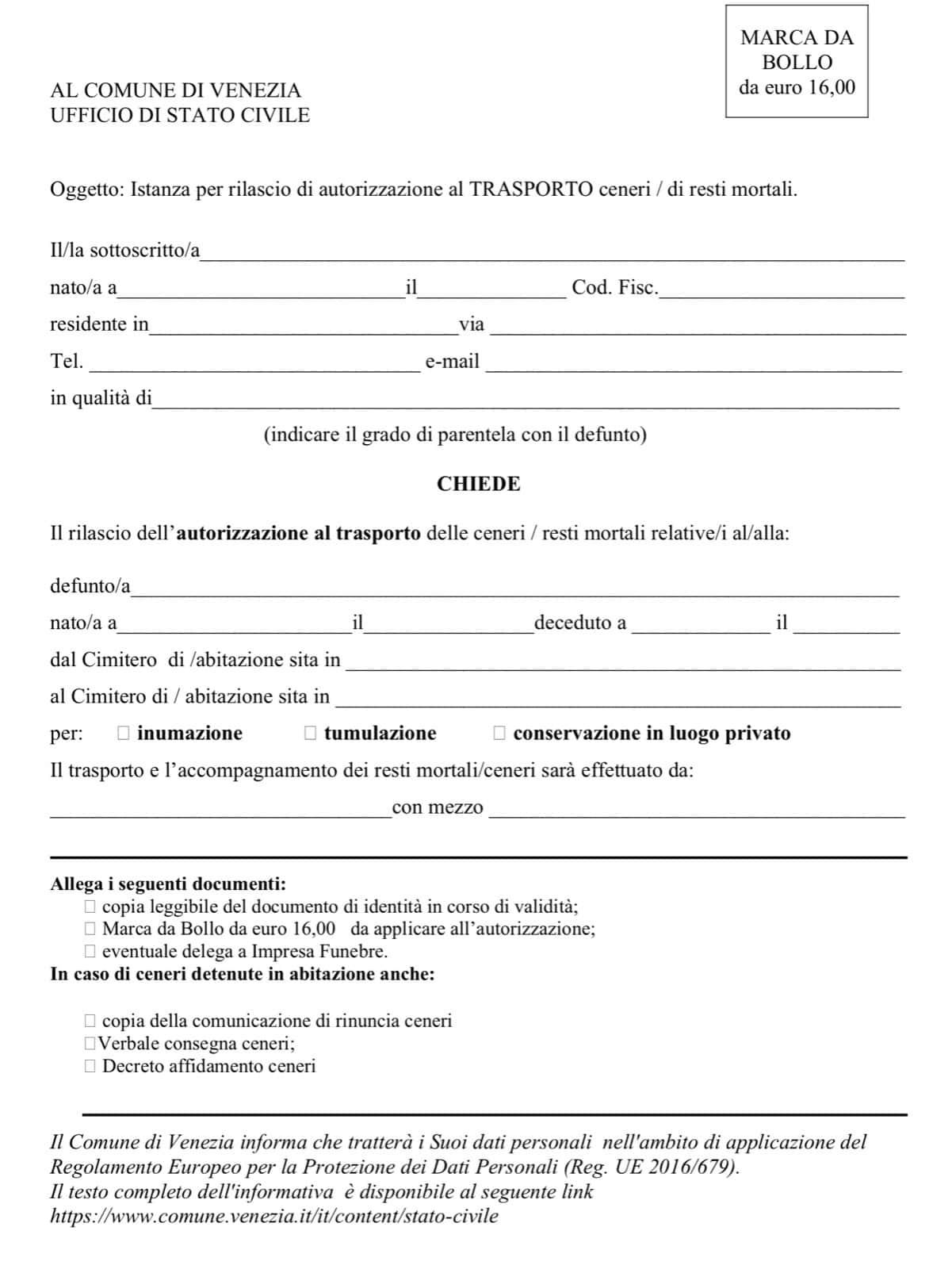 L’articolo 23 del D.P.R. 10 settembre 1990, n. 285, sull’approvazione del regolamento di polizia mortuaria prevede che l’incaricato del trasporto di un cadavere deve essere munito dell’autorizzazione del Sindaco che deve essere poi consegnata al custode del cimitero. L’articolo 3 della tariffa parte prima prevede che l’imposta di bollo è dovuta, nella misura di 16 euro per ogni foglio.