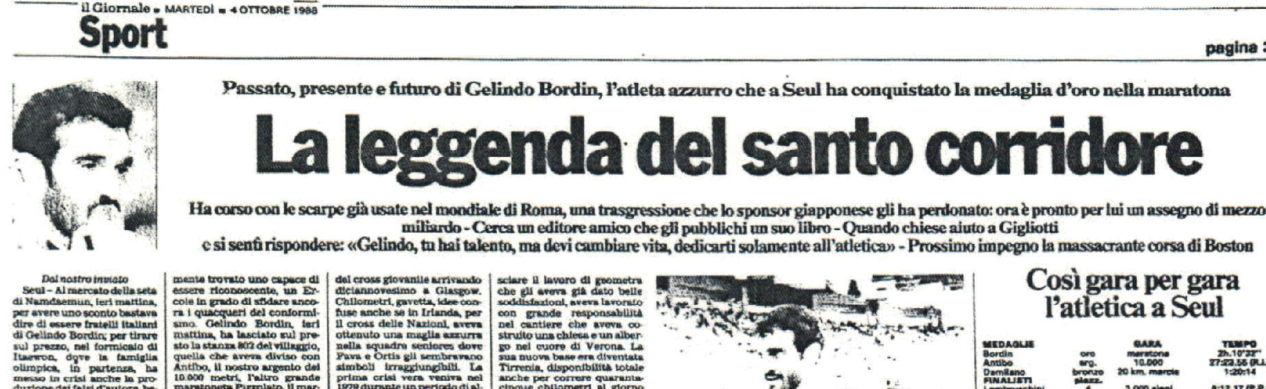 Al successo europeo fece seguito il bronzo mondiale conquistato in casa a Roma in una giornata dettata dal caldo torrido. E si arriva all’anno di grazia targato 1988. Bordin ha ventinove anni, l’esperienza e l’età giusta per essere protagonista a quell’olimpiade che vedeva alla partenza dei “calibri” come il keniota Wakihuri e il gibutiano Salah.