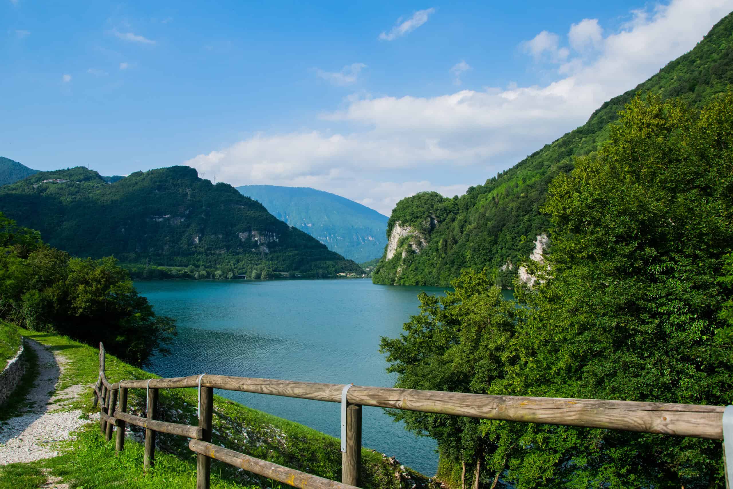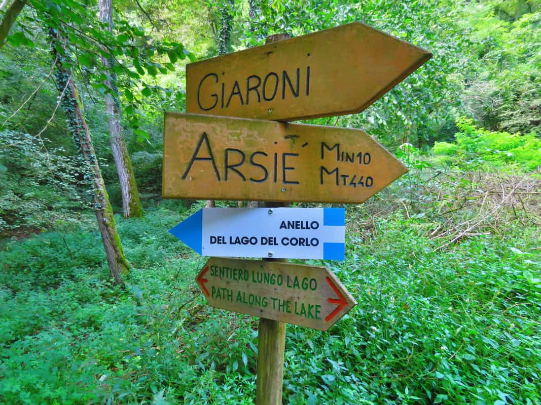 Al termine della leggera salita svoltiamo a sinistra, qui troviamo anche la diramazione del sentiero per raggiungere Arsié, e riprendiamo il sentiero che percorre il lungo lago alla volta del Camping Le Gajole.