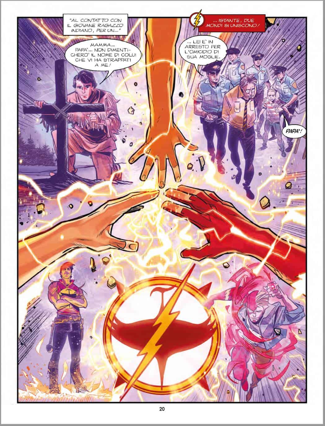 È interessante notare come Gianfelice interpreti anche diversamente la muscolarità di Flash, cogliendo intelligentemente pose differenti di Flash rispetto alla controparte bonelliana. Quando si parlava di rispetto della tradizione di questi due personaggi, ci si riferiva anche a questo, al cogliere l’essenza dello spirito dei due eroi anche nella narrazione visiva, compito che Gianfelice ha svolto egregiamente cogliendo i giusti momenti muscolari, le pose tipiche e vivide dei due eroi., ulteriormente valorizzate dai colori di Luca Saponti.