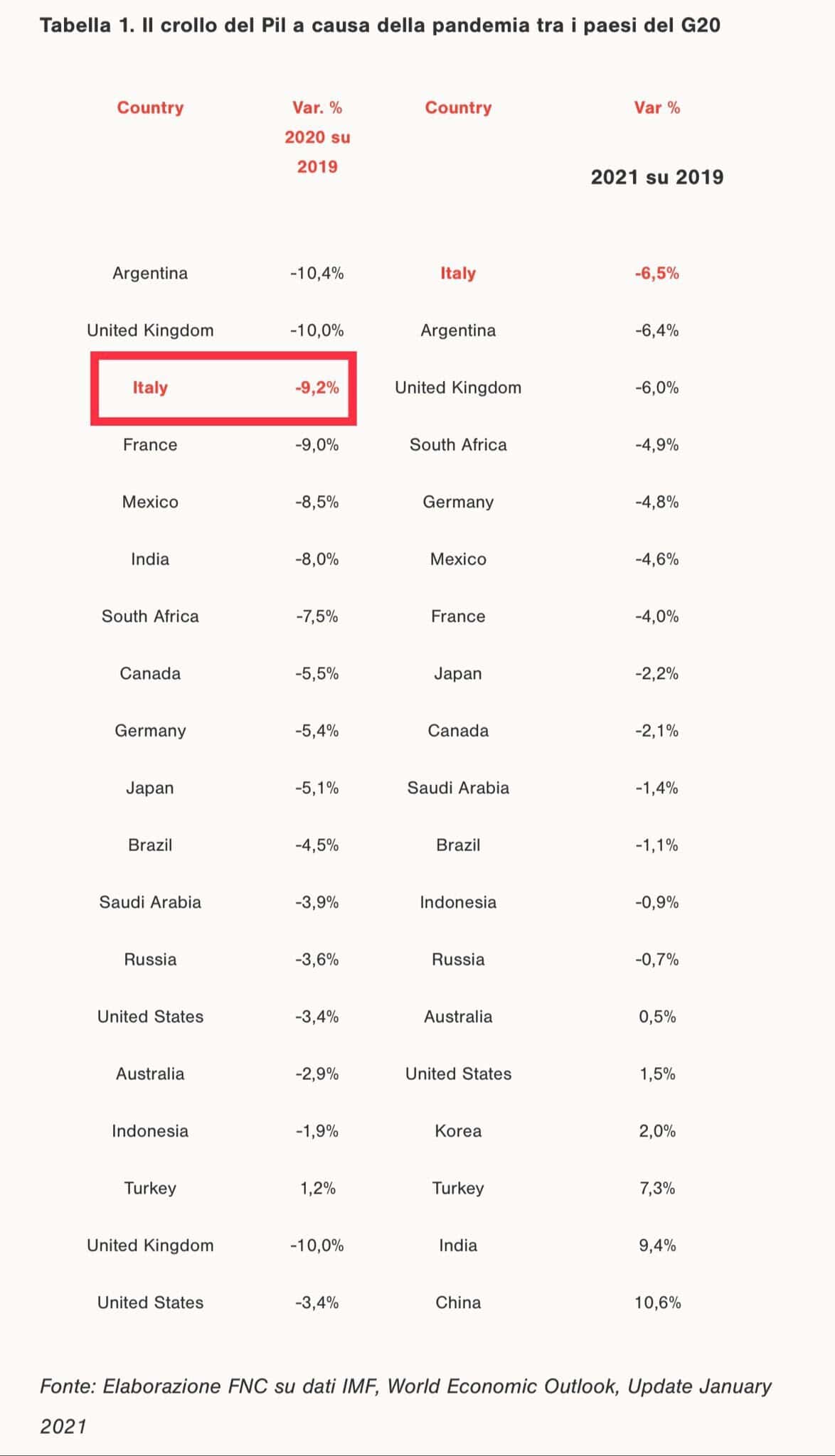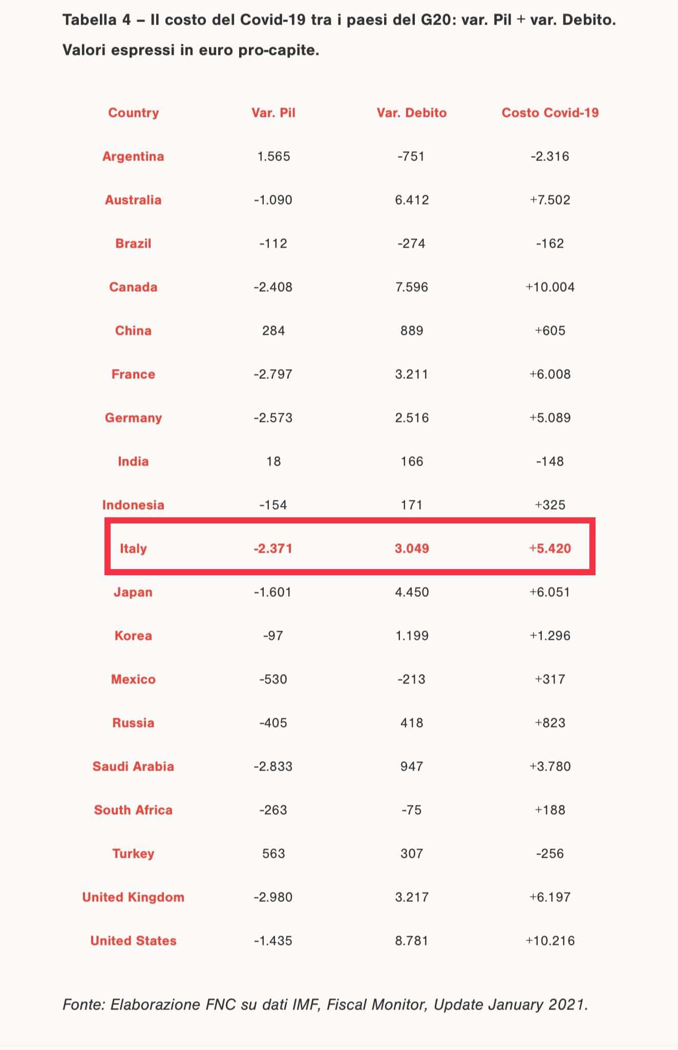 Nel 2020 la pandemia da Covid-19 è costata all’italiano medio 5.420 euro a testa, di cui 2.371 euro di minore Pil pro capite e i restanti 3.049 euro di incremento di debito. In base ai più recenti dati del Fondo Monetario Internazionale, emerge come il crollo del PIL reale per l’Italia, stimato per l’anno appena concluso al -9,2%, (-8,9% secondo gli ultimi dati Istat) sia il peggiore calo dopo l’Argentina (-10,4%) e il Regno Unito (-10%) mentre, a causa di un rimbalzo troppo corto nel 2021, l’Italia presenterebbe il calo del Pil maggiore nel biennio 2020-2021 (-6,5%).