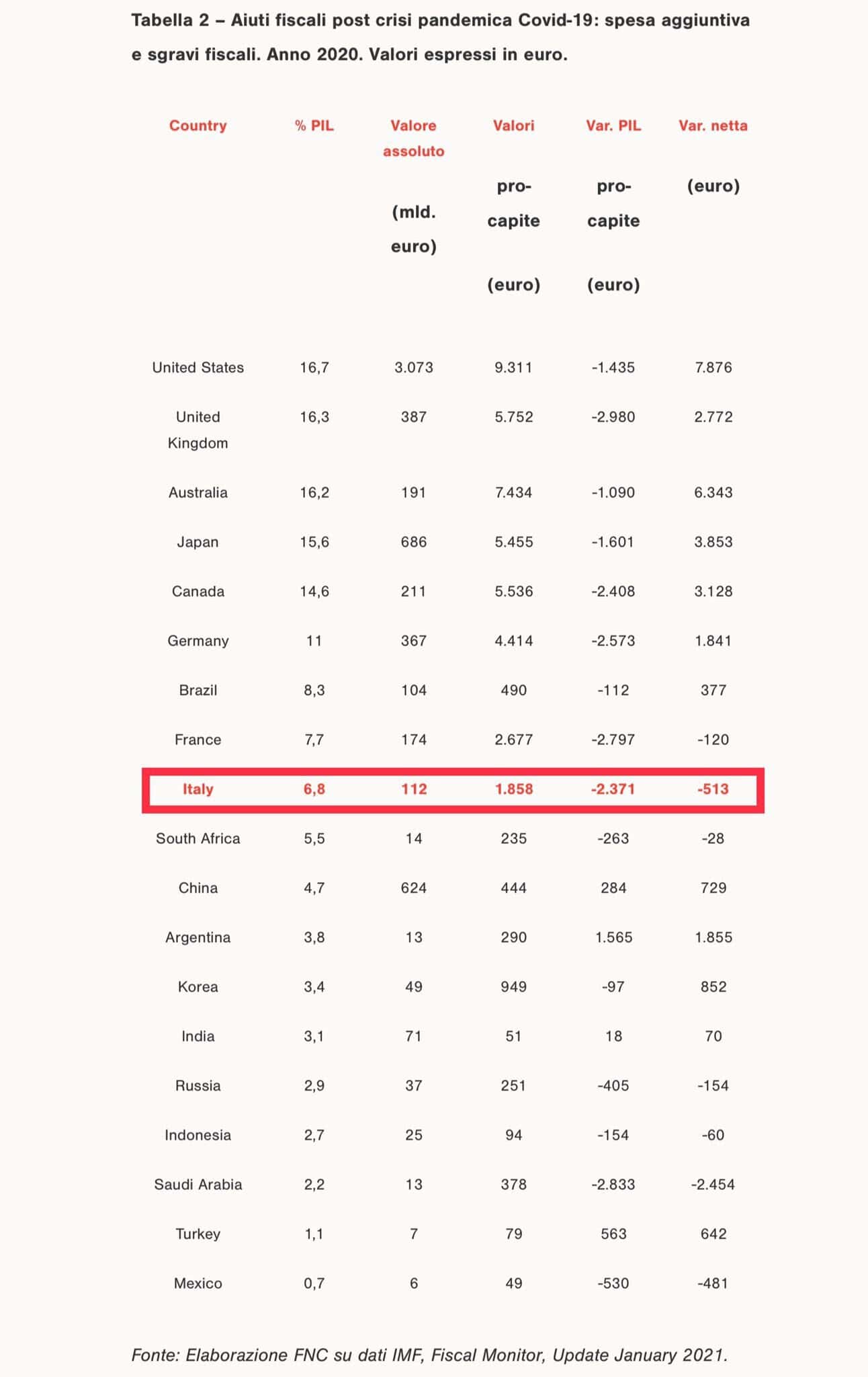 Nel 2020, la spesa pubblica aggiuntiva e gli sgravi fiscali per far fronte alla pandemia hanno raggiunto il 6,8% del Pil collocando l’Italia al 9° posto nel G20. In termini pro-capite, cioè in media