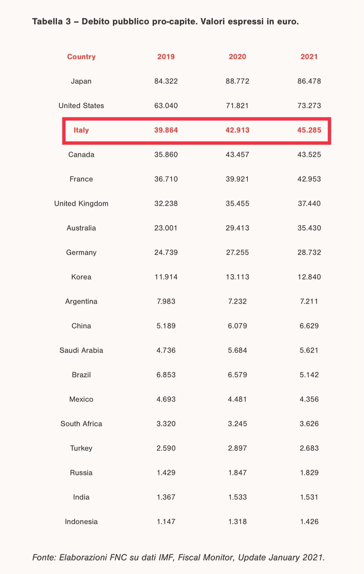 Per quanto riguarda il debito pubblico, nel nostro paese, l’anno scorso, in termini pro-capite aumenta di 3.049 euro. Nel 2021 aumenta di altri 2.372 euro a testa e nel biennio cresce in totale di 5.421 euro. Per effetto della pandemia, il debito pubblico italiano a livello pro-capite e cioè per ogni italiano in media passa da 39.864 € del 2019 a 42.913 € del 2020. Nel G20 si colloca al terzo posto insieme al Canada e dopo Stati Uniti e Giappone e nel 2021 arriva a 45.285 euro.