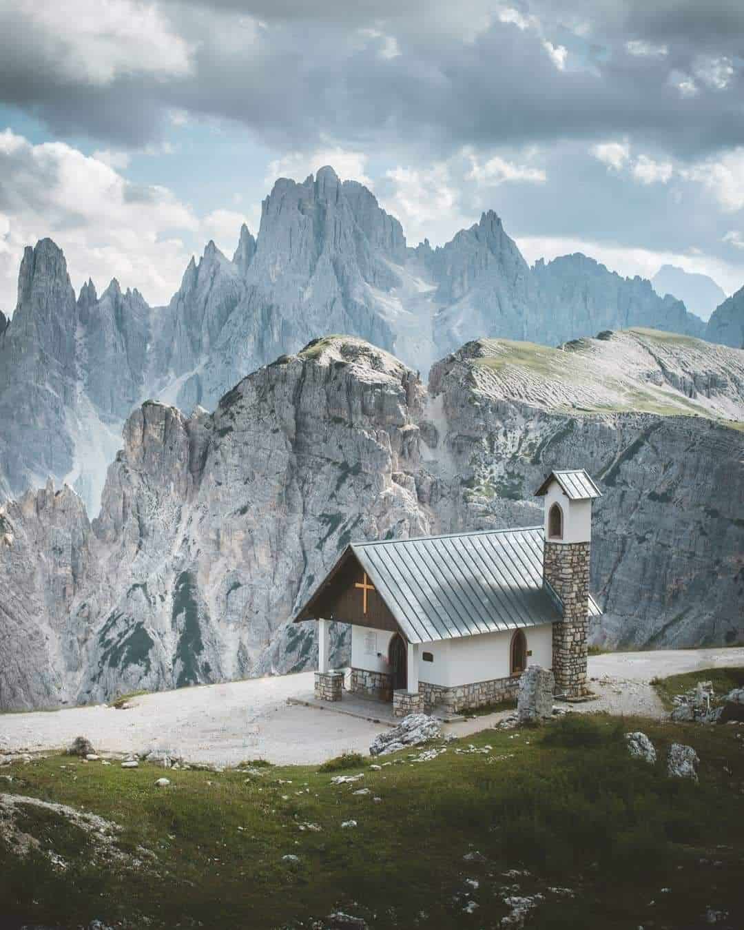 Dalla chiesetta si vedono ora sopra di noi tutte e tre le Tre Cime: la Cima Ovest sulla sinistra, la Cima Grande nel mezzo, e la Cima Piccola a destra. Proseguendo verso il rifugio Lavaredo la stupenda linea dello Spigolo Giallo appare in tutta la sua bellezza, e ricorda agli alpinisti la bravura di Emilio Comici, mitico scalatore triestino che nel lontano settembre del 1933 vi tracciò una via leggendaria, diventata poi una salita “classica” e ancor oggi affrontata con rispetto e cautela.