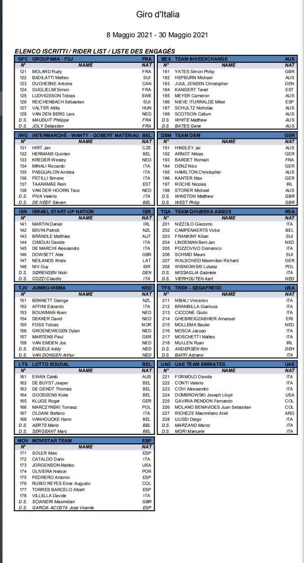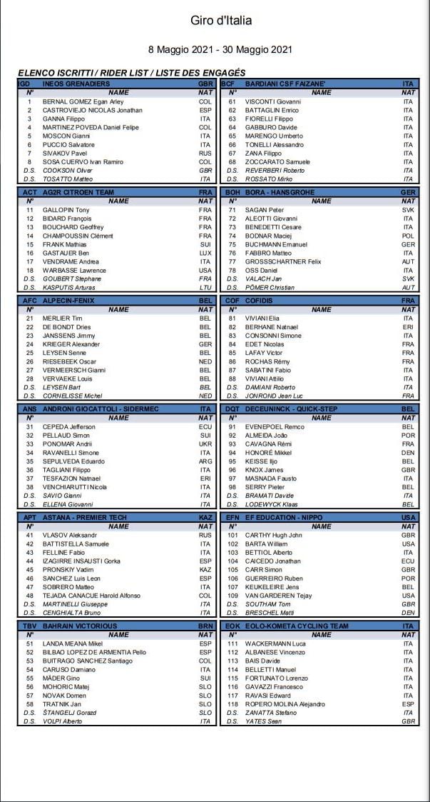 Tra gli uomini di classifica che cercheranno di incidere il loro nome sul Trofeo Senza Fine, Egan Bernal (Ineos Grenadiers) parte con il dorsale numero 1. Il Team BikeExchange si presenta con una squadra interamente a supporto del suo capitano Simon Yates, che ha già dato prova della sua forma andando a vincere il Tour of the Alps. La Trek-Segafredo schiera due punte con il due volte vincitore della Corsa Rosa Vincenzo Nibali, al rientro dopo l’infortunio al polso, e Bauke Mollema, il trionfatore del Lombardia ’19 che quest’anno ha già vinto in Italia il Trofeo Laigueglia. Due capitani anche per il Team DSM con Jai Hindley, secondo sul podio di Milano del Giro 103, e Romain Bardet, due volte sul podio del Tour de France. Due saranno le punte anche per la Deceuninck – Quick-Step con Remco Evenepoel, al rientro dopo l’incidente a Il Lombardia 2020 e João Almeida, 15 giorni in maglia rosa e quarto nella Generale del Giro 2020. Anche la Bahrain Victorious si presenta al via di Torino con due capitani, Mikel Landa (tre successi di tappa al Giro e un podio finale) e Pello Bilbao, quinto l’anno scorso e visto in ottima forma al Tour of the Alps. Saranno della partita per la Generale anche il giovane Aleksandr Vlasov (Astana – Premier Tech), Emanuel Buchmann (Bora – Hansgrohe), quarto al Tour del 2019 e Hugh Carthy (EF Education – Nippo), terzo a La Vuelta a España 2020, Daniel Martin (Israel Start-Up Nation), che ha all’attivo due Classiche Monumento come Il Lombardia (’14) e Liège-Bastogne-Liège (’13), George Bennett (Team Jumbo-Visma) e Domenico Pozzovivo (Team Qhubeka Assos).