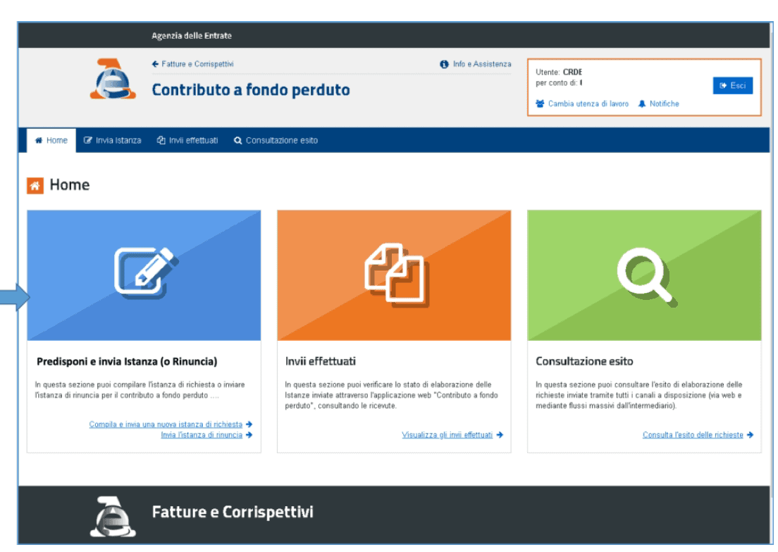 • un’apposita procedura web messa a disposizione dall’Agenzia delle entrate all’interno del portale “Fatture e Corrispettivi”, nella sezione “Contributo a fondo perduto”. Attraverso tale procedura è possibile predisporre e trasmettere un’istanza alla volta.