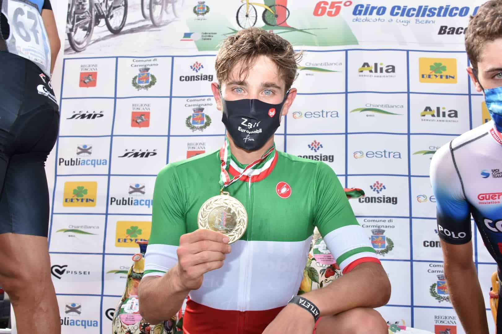 E arrivò anche la trentesima maglia tricolore che corona i quarant’anni della Zalf Euromobil Désirée Fior, società che a sede a Salvarosa di Castelfranco Veneto. Il successo porta la firma di Gabriele Benedetti che si è imposto sul traguardo di Bacchereto, in provincia di Prato. Un’azione iniziata dopo pochi chilometri dal via: in fuga si sono trovati sono sei atleti tra cui è stato bravo ad inserirsi Gabriele Benedetti. I fuggitivi hanno conquistato un vantaggio massimo di sei minuti. Con il passare dei chilometri il gruppo si è avvicinato ai battistrada. Nel finale di gara Gabriele Benedetti ha alzato il ritmo facendo la selezione e involandosi tutto solo quando mancavano 10 chilometri all’arrivo. Un finale in perfetta solitudine quello che ha accolto Benedetti sul traguardo di Bacchereto.