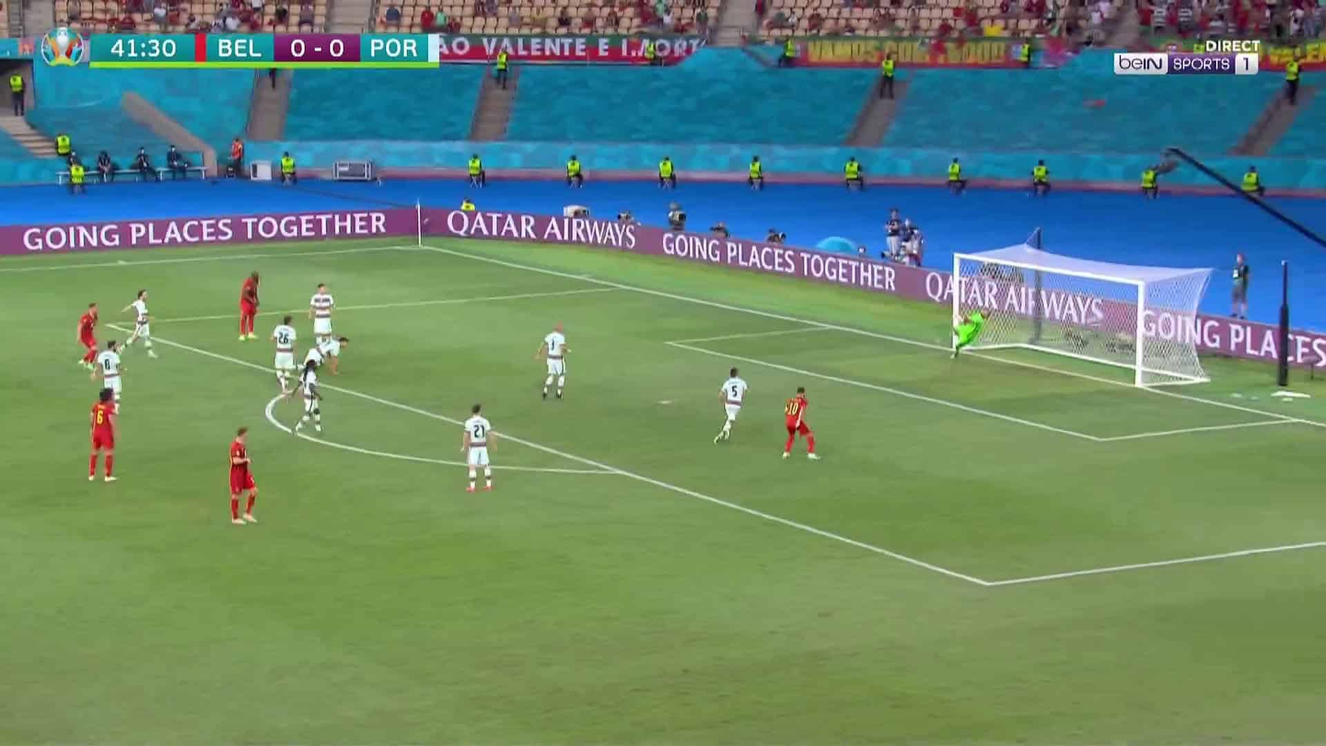 Entrambe provano a sbloccare la partita. Il Portogallo ci prova con Ronaldo su punizione mentre il Belgio non si vergogna ad affidarsi anche a lanci lunghi per la corsa di Meunier. Al 25’, sulla destra e da una posizione pertanto consigliata per un mancino, Cristiano Ronaldo tira molto potente e la sua conclusione, seppur centrale, crea difficoltà a Courtois, non perfetto nell’indirizzare il pallone con i suoi pugni. Ci vorrebbe un lampo per sbloccare la partita e questo arriva proprio verso la fine del primo tempo: gli esterni del Belgio giocano dentro il campo e un passaggio in orizzontale di Meunier per Thorgan Hazard mette quest’ultimo in condizione di andare al tiro. La conclusione di Hazard non è angolata, ma tanto forte e ad effetto che prende in controtempo Rui Patricio.