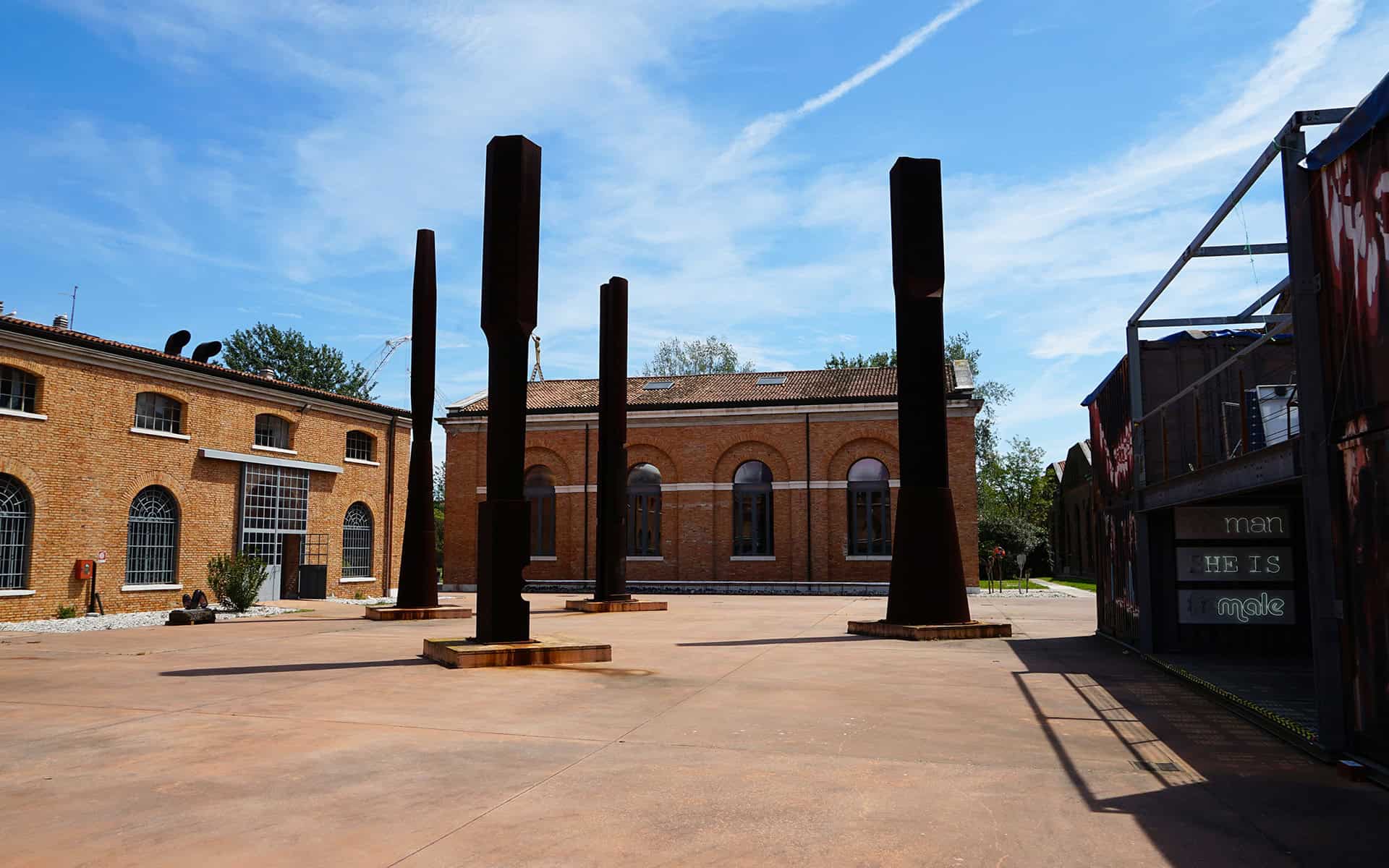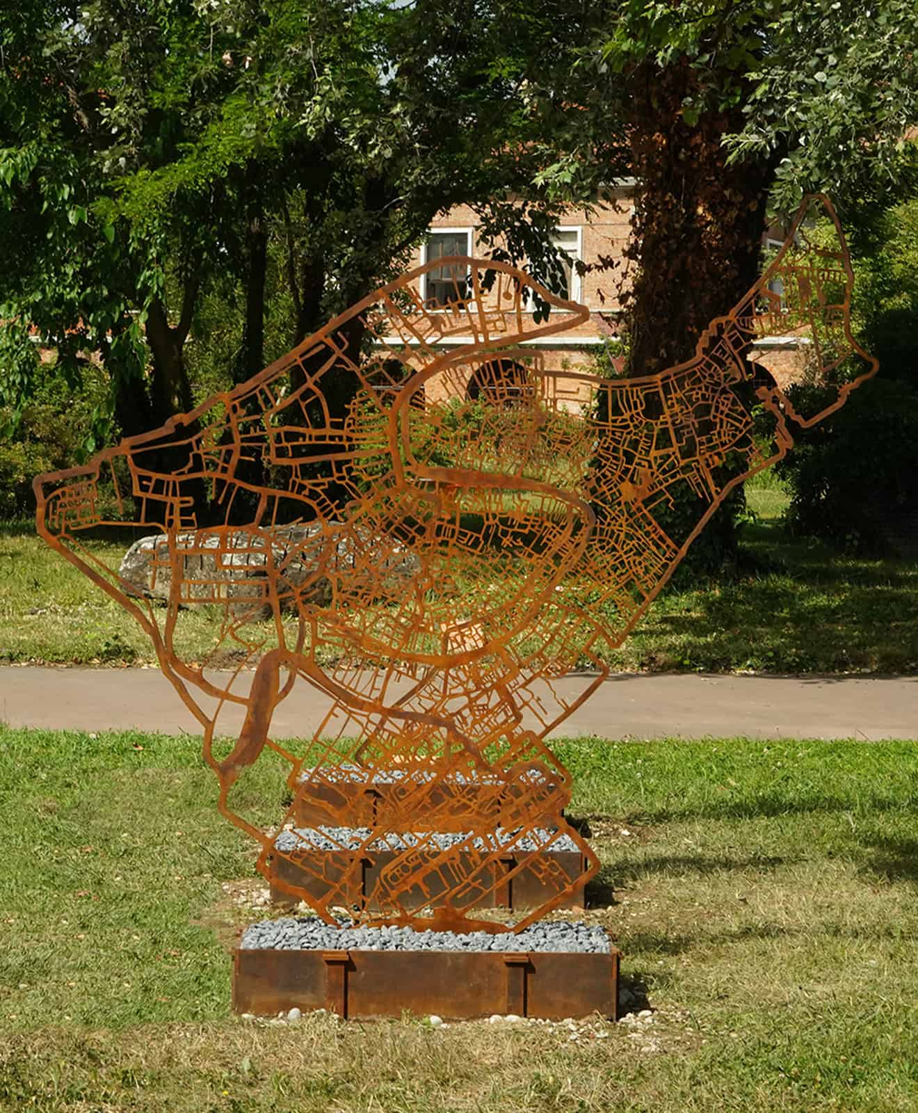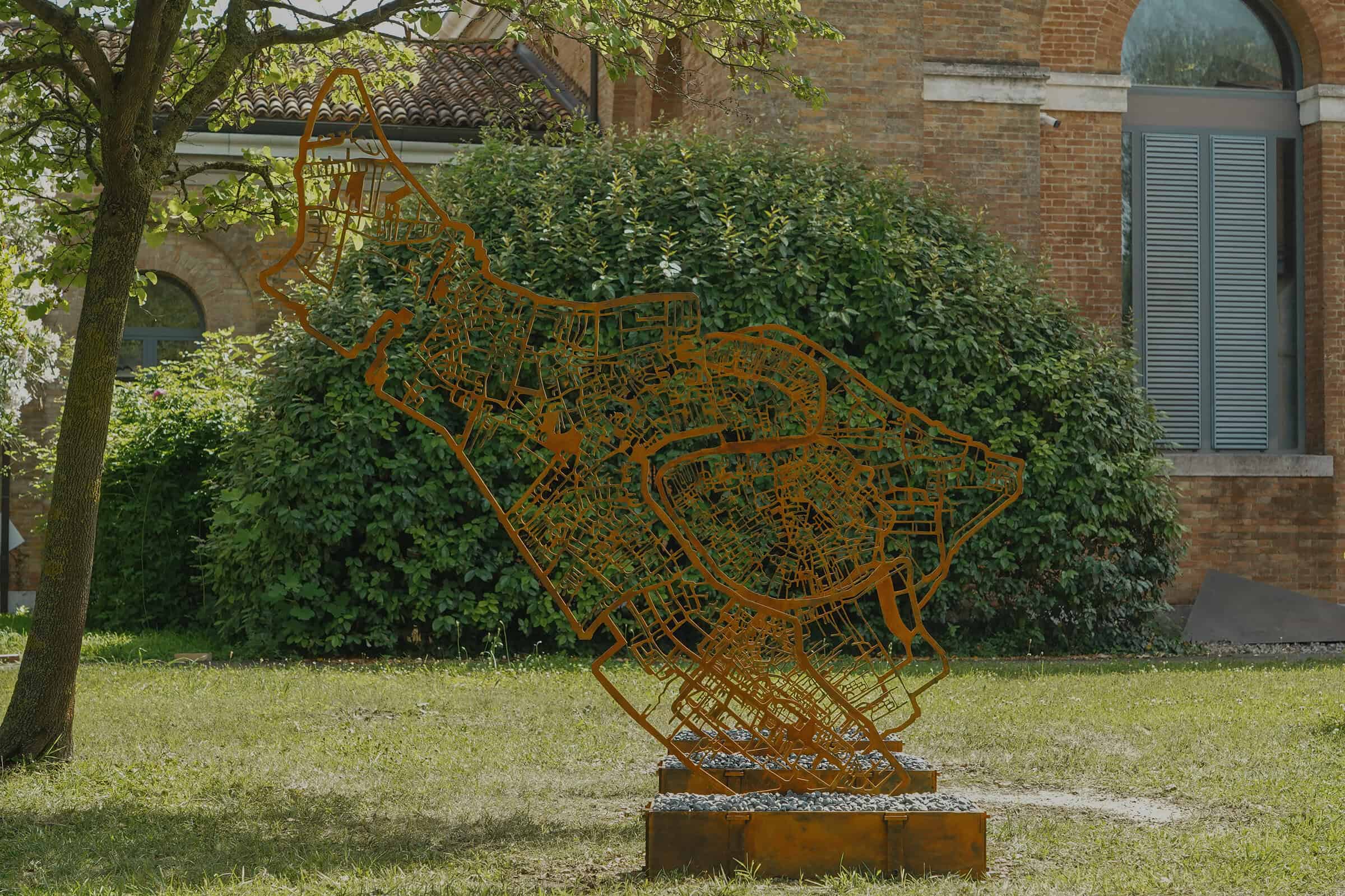 Tre singole strutture in acciaio corten, un merletto di tracce che si sovrappongono e si rivelano, nella loro completezza, solo modificando il punto di osservazione. Quasi a dirci: «Questa è Venezia, ma anche questa lo è, se ti sposti appena un po’; è sempre lei, ma è diversa». Basterebbe poco, e la via muterebbe. Forse, ci verrebbero persino delle idee.