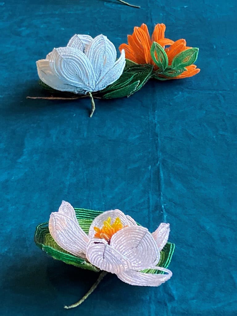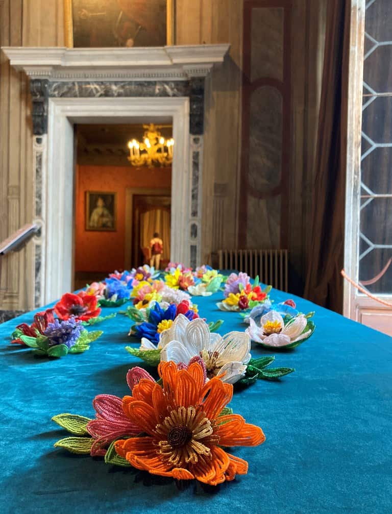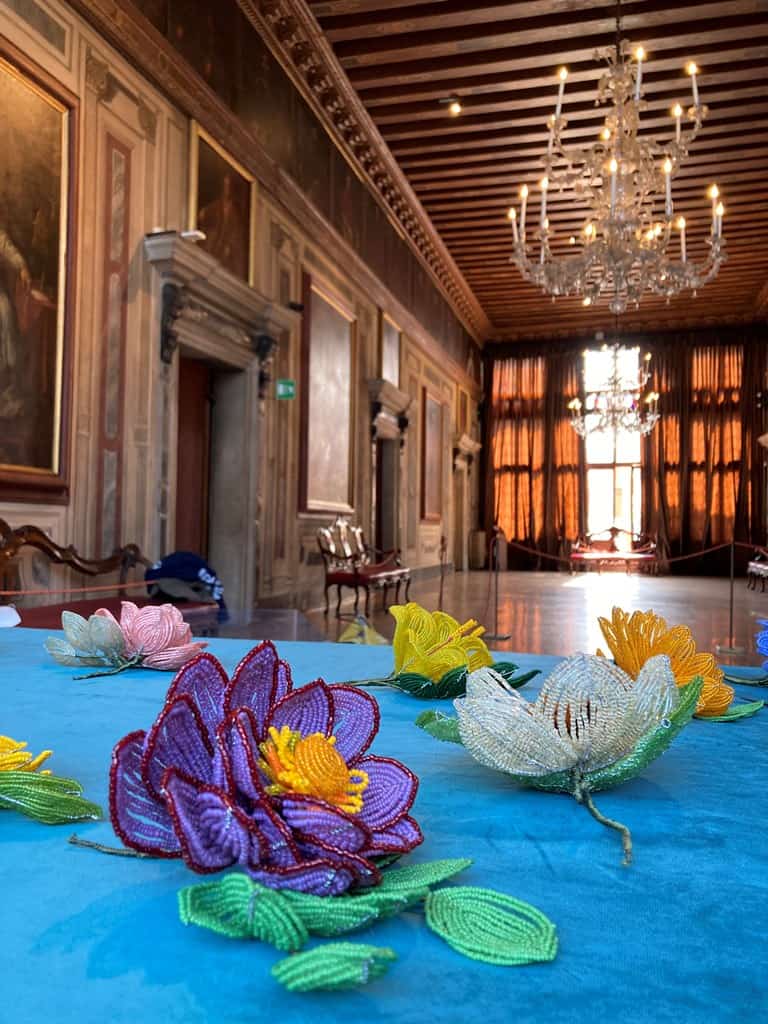 In particolare a Palazzo Mocenigo c’è una mostra davvero suggestiva, in allestimento fino al 30 settembre: “Perle in fiore”. L’artista, Benedetta Gaggia espone fiori straordinari creati con minuscole perle di vetro, usando le antiche conterie muranesi provenienti dall’immenso archivio di famiglia. Boccioli, corolle variopinte, a volte fedeli alla realtà, talvolta magica fantasia. Benedetta recupera con il suo lavoro questa pratica un tempo molto diffusa a Venezia, ma oggi pressoché perduta. Una passione ereditata dalla madre, Mariagrazia Gaggia che è stata allieva della leggendaria Nella Lopez y Royo Sammartini.