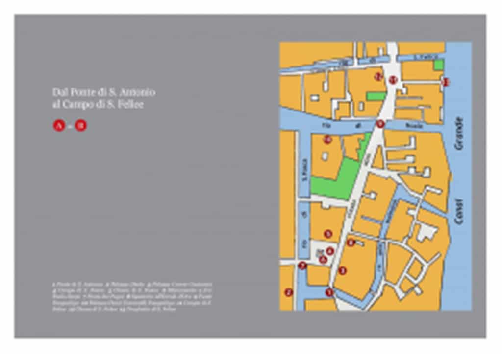 Dopo una prima parte storica dedicata allo sviluppo urbanistico del Sestiere (pp. 11-25), Lazzari propone il suo percorso come una visita guidata che parte dal ponte di Sant’Antonio e ci accompagna fino al Campo Santi Apostoli, soffermandosi sulla descrizione di palazzi, chiese, campi, ponti,  raccontando aneddoti gustosi e sottolineando particolari che possono sfuggire al visitatore, come ad esempio il dettaglio della scultura raffigurante una gondola alla sommità di una finestra superiore sulla facciata della Chiesa di San Felice (p. 49), oppure la “pantegana” che si può scorgere su di una colonna prospiciente il Canal Grande alla fine della calle del traghetto. Nel testo trovano spazio, oltre a illustrazioni, mappe e riproduzioni di incisioni, anche delle schede monotematiche che approfondiscono alcuni aspetti storici relativi alla Repubblica di Venezia. Come ad esempio la magistratura degli Esecutori alla bestemmia (p. 37), l’affaire Paolo Sarpi (p. 39), le Scuole di devozione (p. 55), gli squeri (p. 62).