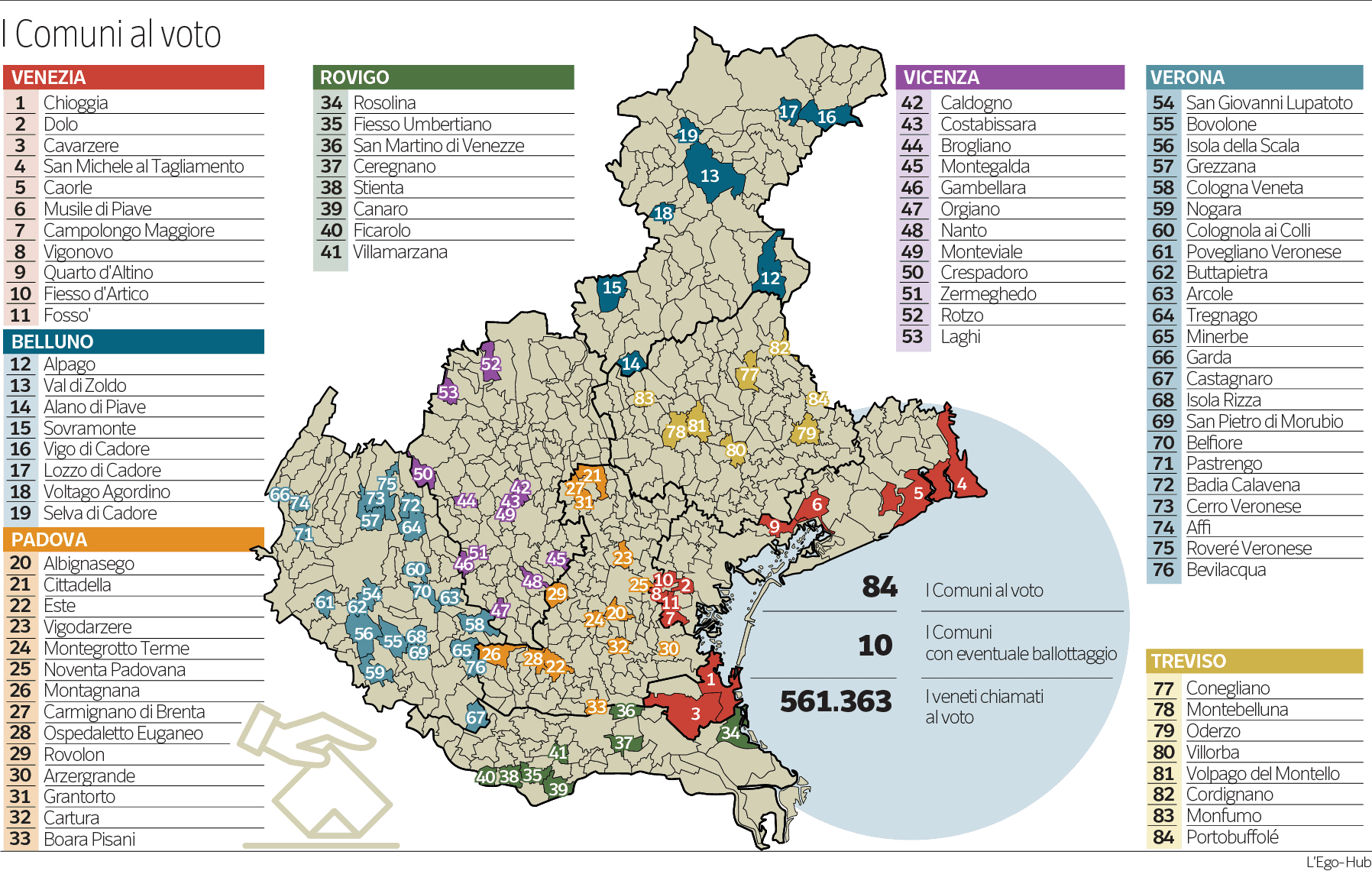 In Veneto da tenere sotto osservazione, nel veneziano, Chioggia, il maggiore dei Comuni al voto con oltre 50mila abitanti. Il centrodestra compatto punta a sfondare al primo turno per non rischiare, al ballottaggio, di ritrovarsi Pd e 5 stelle coalizzati, e pronti a raccogliere anche i voti delle altre liste concorrenti.