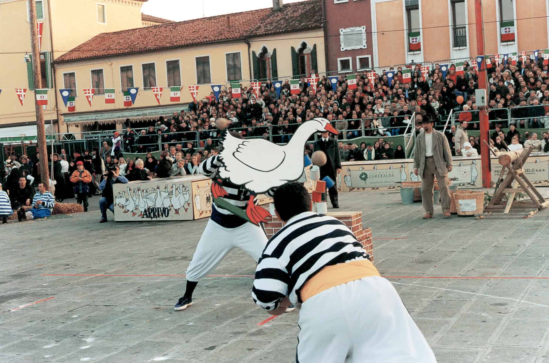 Protagonista è l’oca, in ossequio al detto veneziano “Chi no magna l’oca a San Martin no fa el beco de un quatrin”: chi non mangia l’oca a San Martino non fa il becco di un quattrino. Perché in quei giorni il gioco, la ricostruzione storica, l’enogastronomia tipica affondano le radici nella tradizione, che vedeva in quel periodo dell’anno la carne del pennuto diventare così grassa e tenera da sciogliersi in bocca. E in un’epoca in cui i proprietari terrieri di Mirano erano in gran parte ebrei e non potevano mangiare maiale, l’oca divenne presto la regina, non solo del cortile, ma anche della tavola.