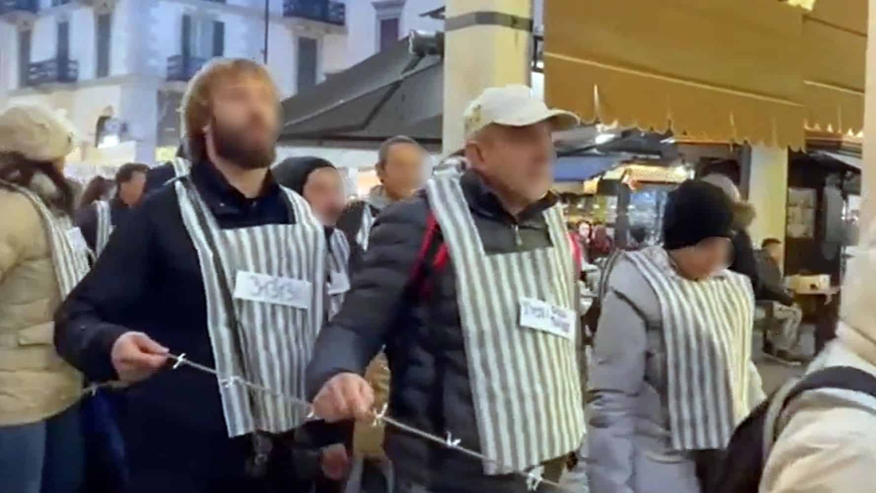 Veder passeggiare queste “persone“ con pettorine che simboleggiavano i deportati ebrei durante l’inizio della Shoah. Tra l’altro equipaggiate anche di numero impresso. Legate tra loro da una corda che voleva mimare i fili spinati dei campi di concentramento. In tutta sincerità, mi ha creato una tempesta emotiva di proporzioni sesquipedali, nella mia mente e nei miei pensieri. Tanto che trovo difficoltà a descrivere tanto tumultuose sono le ingiurie e gli improperi che vorrei urlare a queste, se così posso chiamarle, persone.