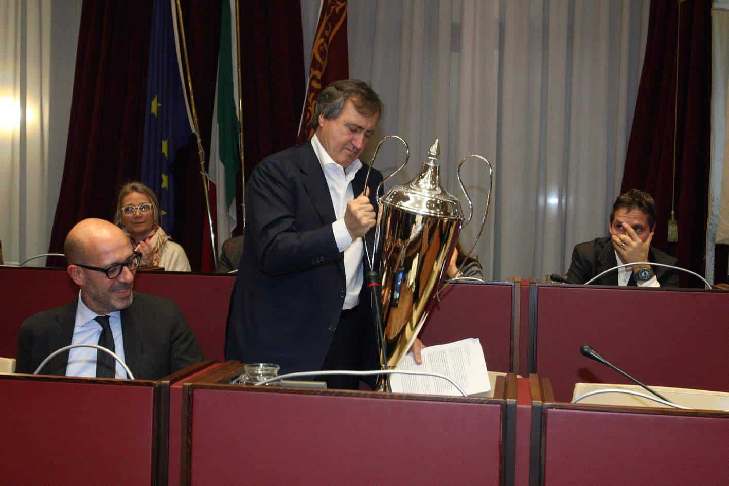 Nel suo primissimo intervento, da primo cittadino, in Consiglio comunale, dirà solennemente: “Fino a che sarò sindaco, sui Pili non metterò becco”. E infatti gli cresce il naso. Nel 2017, consiglio comunale, previsto in via Palazzo a Mestre, tira fuori come “coupe de theatre”, la coupe, nel senso di coppa, dello scudetto del basket, vinto dalla sua Reyer. Brugnaro vuole realizzare il nuovo palazzetto dello sport ai Pili. Ne ha mille ragioni. Il CONI impone palazzetti idonei per le squadre di serie A e il vecchio Taliercio, costruito a risparmio nel 1978, con i suoi 3.500 posti, non è più all’altezza. Apriti cielo. C’è il conflitto di interessi.