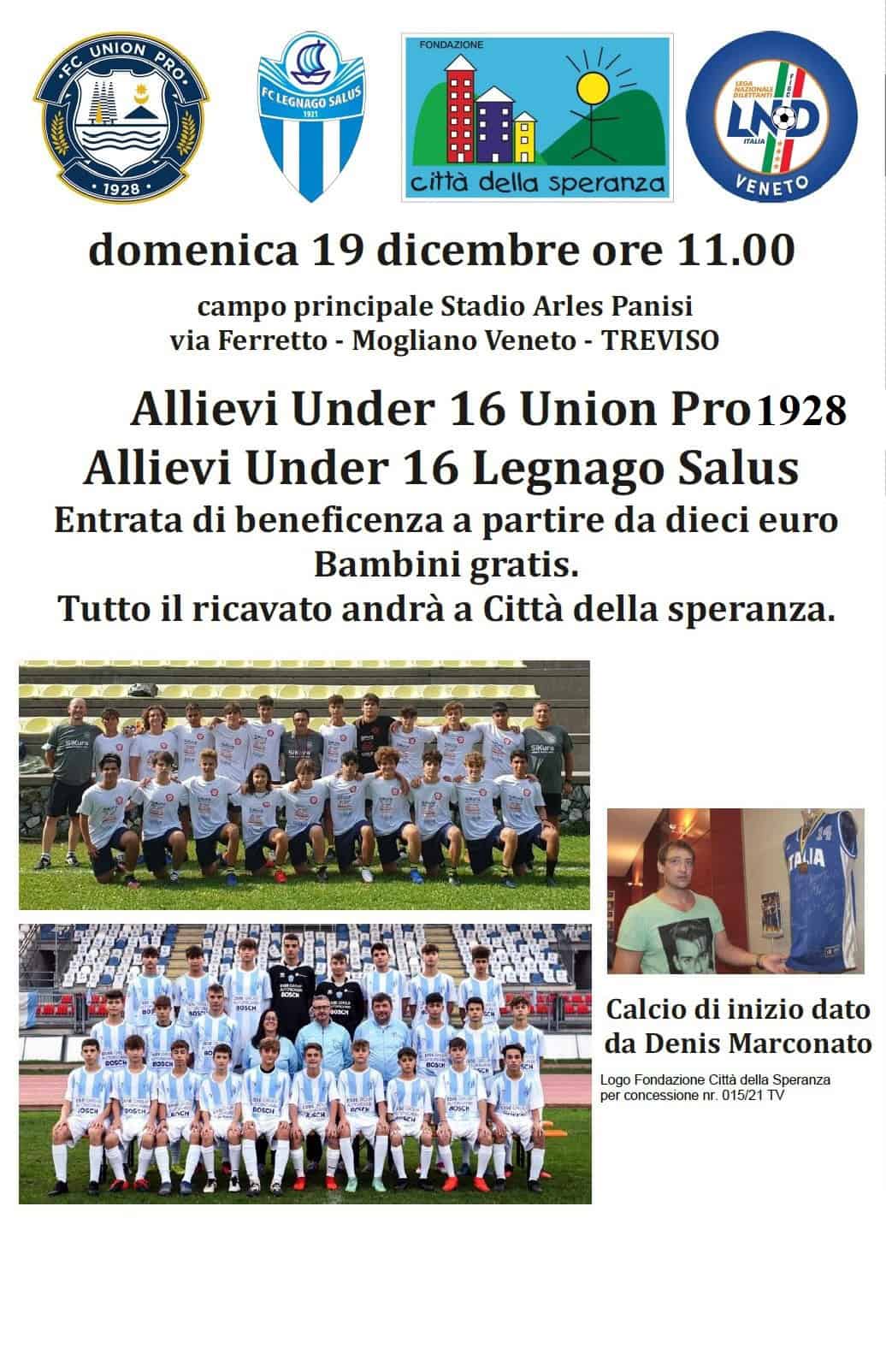 “Diamo un calcio al cancro”. Questo il titolo scelto per l’amichevole classe 2006 tra Union Pro 1928 e Fc Legnago Salus. La partita ha lo scopo di raccogliere fondi per la Fondazione Città della Speranza che da anni si occupa di seguire i bambini oncologici. Un regalo a tutti i “piccoli” che lottano ogni giorno contro un grande male e trasmettere la forza per vincere questa battaglia. Saranno presenti le autorità, il Presidente LND Veneto Ruzza con alcuni delegati e rappresentanti del mondo sportivo.
