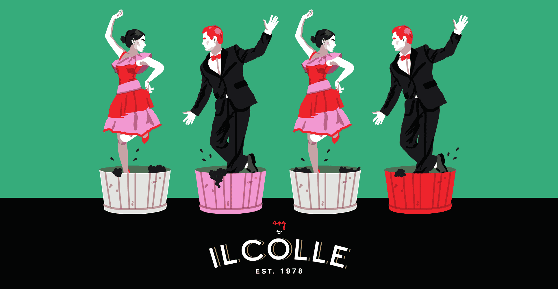 “Tenendo in considerazione il consumatore, l’idea di una festa gioiosa e mantenendo sempre un profilo legato alla tradizione, ho immaginato di rivoluzionare il metodo più antico di vendemmia. Uomini e donne ben vestiti, ballano euforici all’interno dei tini, schiacciando i chicchi dell’uva. La scelta cromatica è stata semplice, colori brillanti ed allegri”.