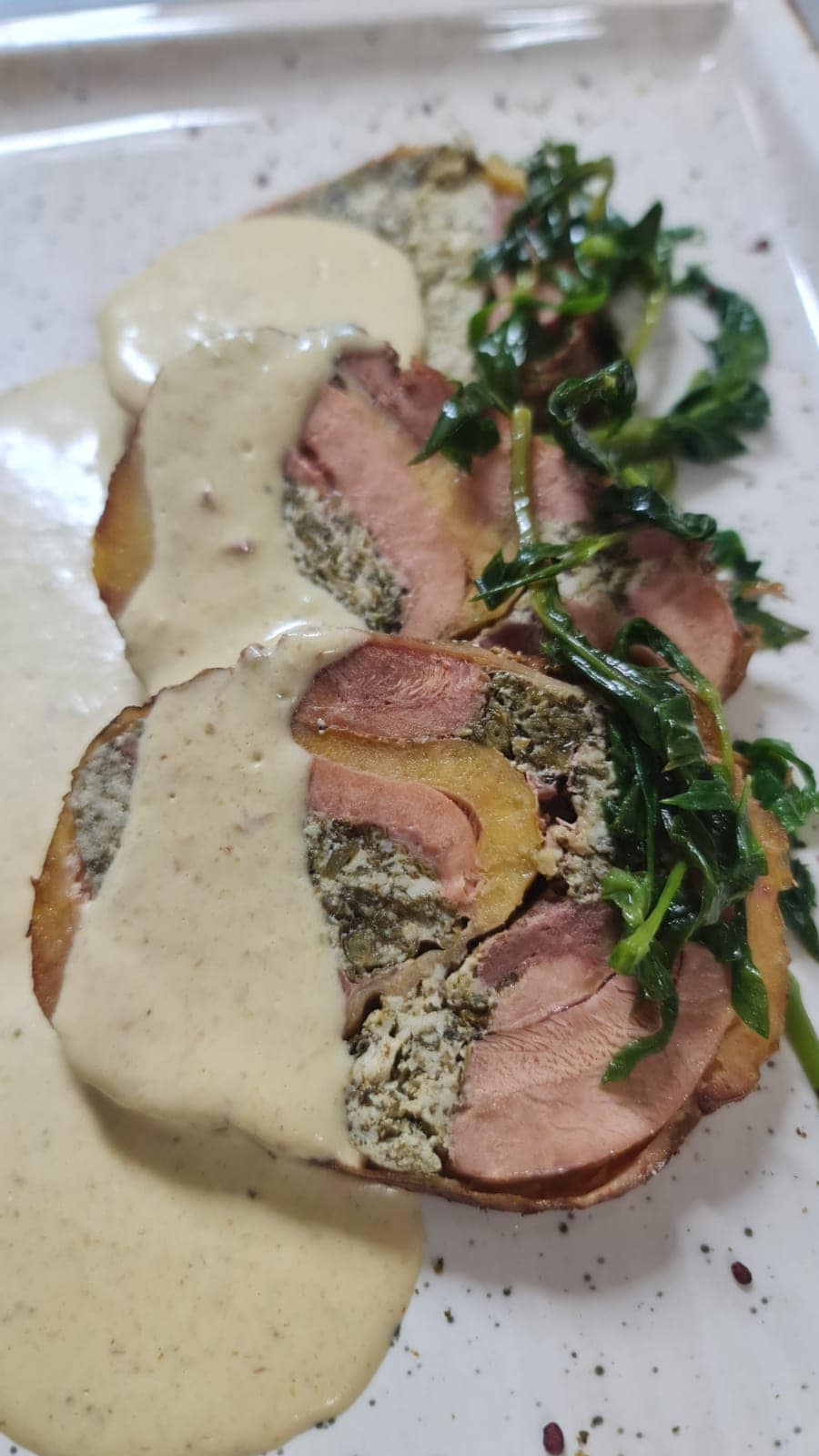 Componiamo il piatto con la faraona a fette e la salsa di accompagnamento.