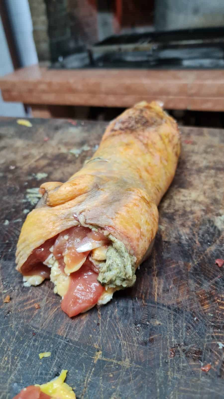 Per iniziare, prendiamo la faraona, disossiamola e stendiamola bene. Nel frattempo preparariamo la farcia di pollo e carletti; il pollo va tagliato a brunoise in modo tale che si riesca a frullare insieme ai carletti (precedentemente sbollentati per un paio di minuti e raffreddati), infine saliamo e pepiamo. Lasciamo riposare in frigo per una mezz’ora. Mettiamo la farcia sulla faraona con una leccapentole e stendiamola in modo omogeneo. Arrotoliamola delicatamente e leghiamola senza stringere troppo con uno spago da cucina.