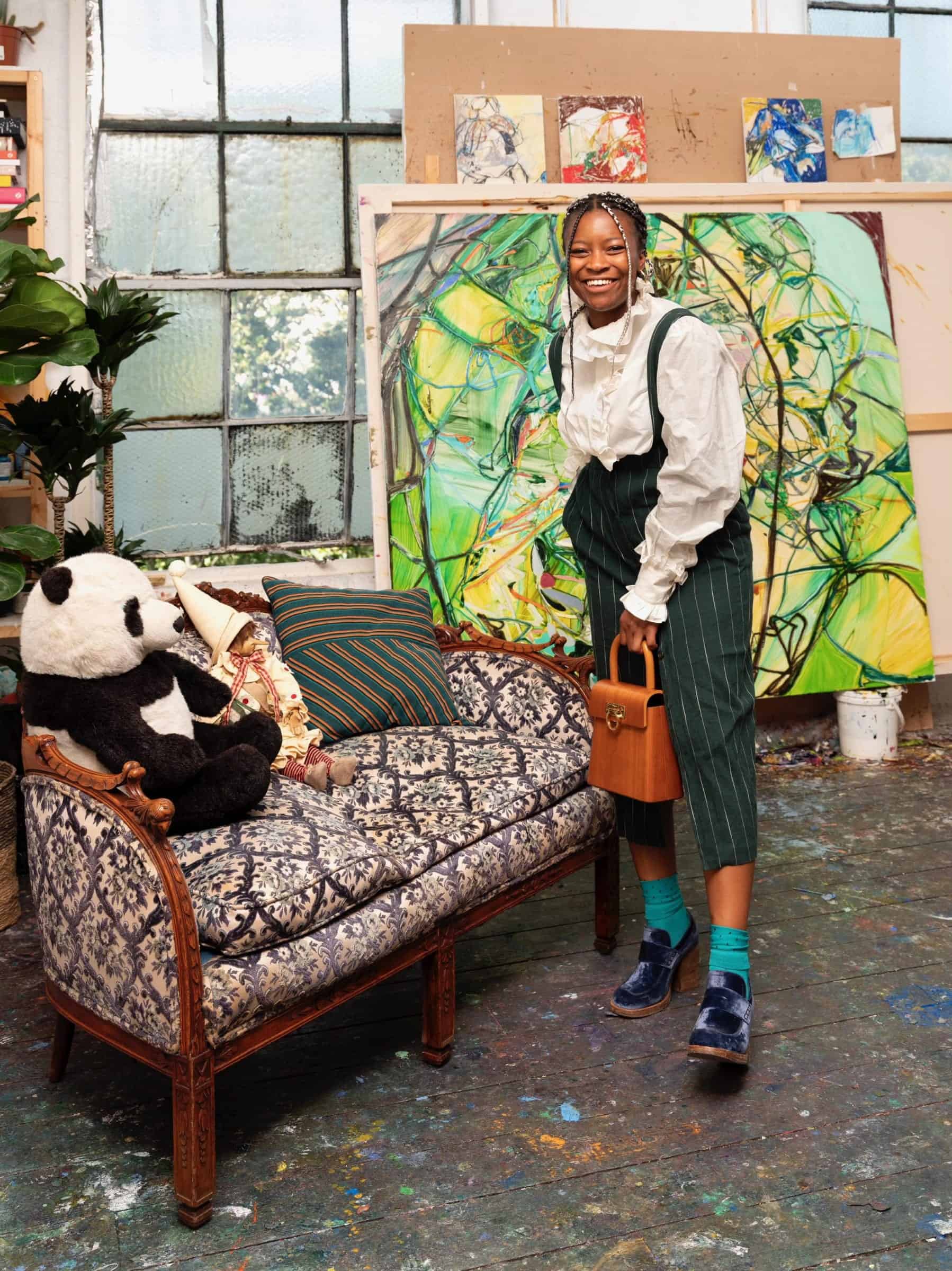 Sono talenti incredibili che regalano esperienze estetiche e visive di altissimo tenore. Una di questa è sicuramente la britannica Jadé Fadojutimi, classe 1993 che vive e lavora a Londra. A Venezia Jadé che incanta per il suo sorriso e il suo look country, ha portato tre opere monumentali: “The Prolific Beauty of our Panicked Landscape”, “And that day , she remembered hot to purr” e “Rebirth”, tutte del 2022. Le dimensioni sono importanti e le opere su tela trovano spazio e respiro nel padiglione centrale dei Giardini. Superano i due metri di lunghezza, una di queste è di tre metri, e consentono una visione immersiva nel mondo colorato e naturale di Fadojutimi.