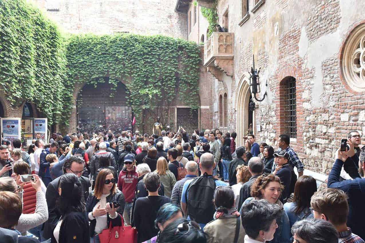 E poi, ecco: un amico, arrivato in gita a Verona in una recente giornata festiva ha fatto questa esperienza: durante la visita a Castelvecchio e ad altri siti di richiamo per il turismo culturale come il Museo archeologico, ha contato pochi visitatori, meno di quelli che si aspettava. Ma poi, ecco la sorpresa finale: alla Casa di Giulietta c’era una vera folla: una fila compatta e paziente in attesa alla biglietteria. Ha scattato una fotografia per documentare l’affollamento davanti a quel “monumento” popolare, famoso non solo da noi.
