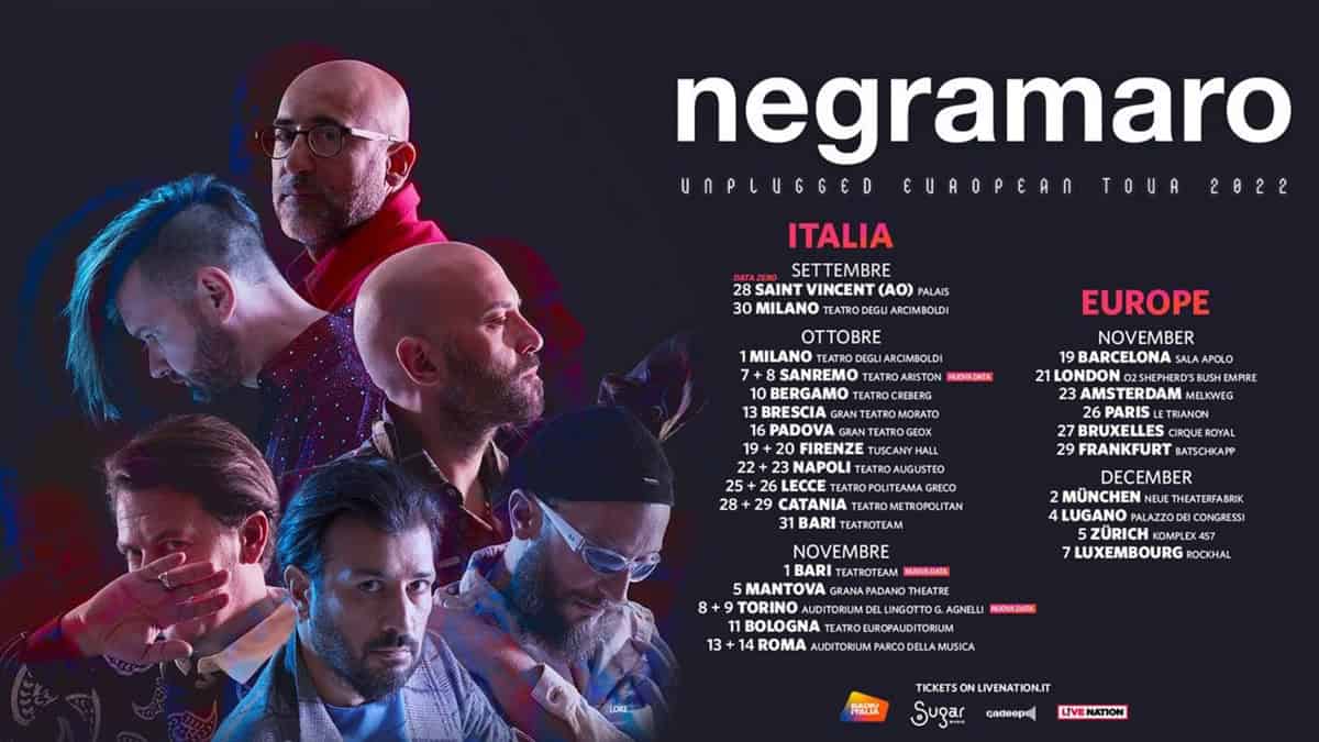 Aggiornamenti per tutti i fan dei Negramaro: la loro musica dal vivo sarà protagonista del nuovo “Unplugged European Tour” in partenza a settembre. Sarà l’occasione per seguire dal vivo la band in una nuova veste acustica. A causa dell’attuale situazione pandemica il tour previsto per marzo e aprile 2022 è cancellato e si sposta in autunno nei maggiori teatri italiani, a cui seguiranno 10 grandi appuntamenti nelle principali capitali europee. Il concerto di Padova si terrà al Gran Teatro Geox il 16 ottobre 2022.