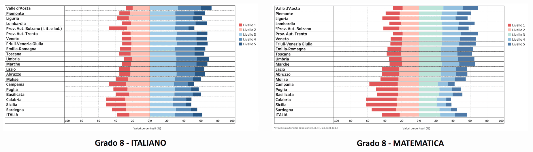 La media Invalsi italiana, che poi viene paragonata a quella dei paesi europei è 61% per l’italiano, 56 per la matematica e per l’inglese rispettivamente 78 (reading) e 62 (listening). Calabria, Campania, Sicilia e Puglia sono ben sotto il 50%. Gli esperti a Roma ammettono “che nello specifico, l’esito medio conseguito nelle regioni del Mezzogiorno, non è sempre in linea con le indicazioni nazionali e si evidenza una marcata disuguaglianza educativa sia in termini di diversa capacità della scuola di attenuare l’effetto delle differenze socio-economiche-culturali sia in termini di differenze tra scuole e soprattutto tra classi”.