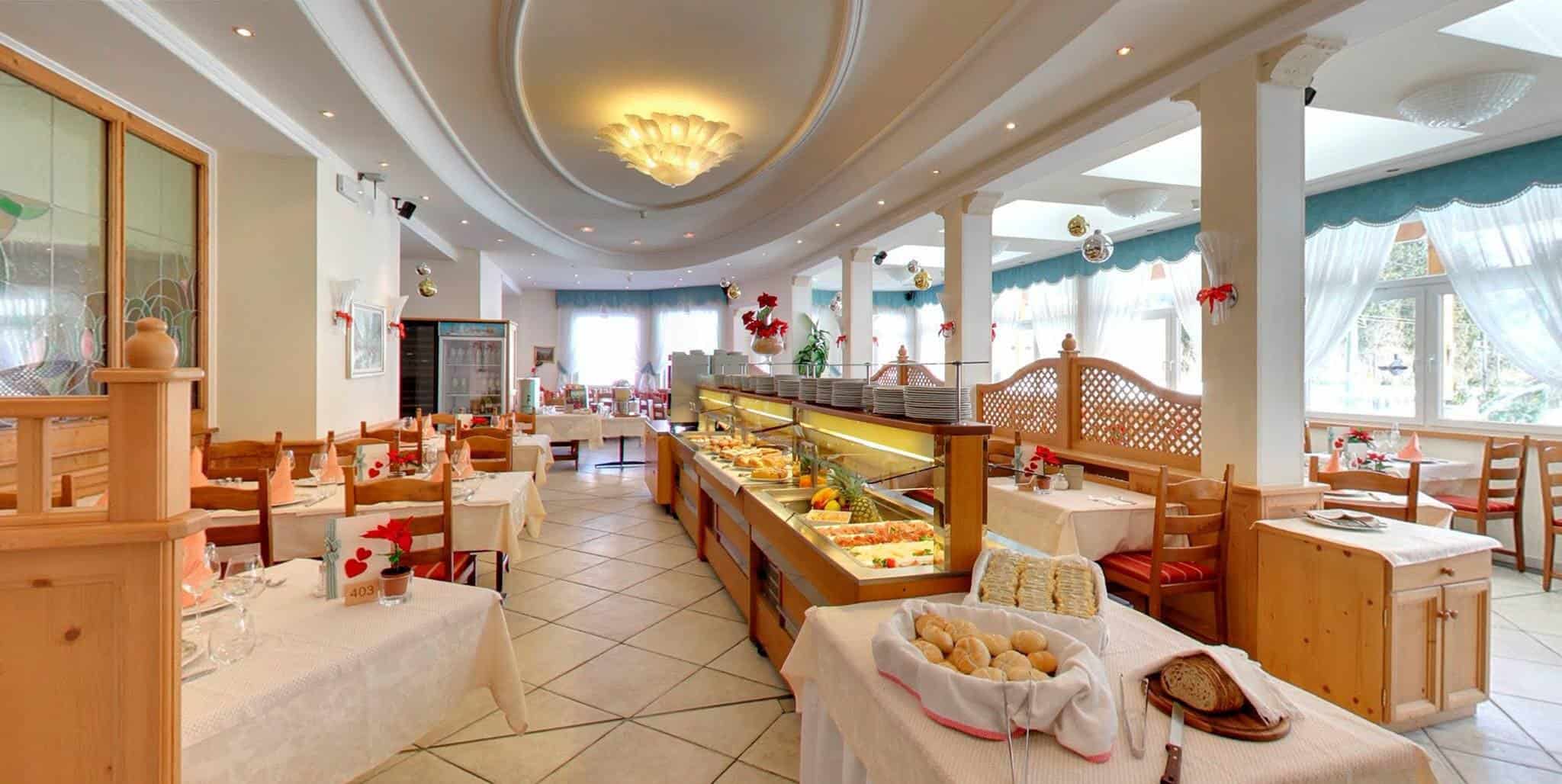 Al rientro in hotel dopo una giornata trascorsa sugli sci, da notare che l’hotel si trova direttamente sulle piste di fondo, si trova un bicchiere di vin brulè o un buon bombardino per riscaldare corpo e anima. Per soddisfare il languorino pomeridiano, l’albergo consente di gustare una sfiziosa merenda con formaggi locali e salumi affettati, tra cui il tipico speck. Il tutto accompagnato da un profumato punch all’arancio fatto in casa oppure una tisana biologica. A pranzo e a cena, nella luminosa sala, si possono gustare i piatti genuini della tradizione alpina e mediterranea, con un menù gluten free per gli ospiti celiaci, paste fresche fatte in casa trafilate al bronzo, un piccolo buffet di antipasti e insalate.