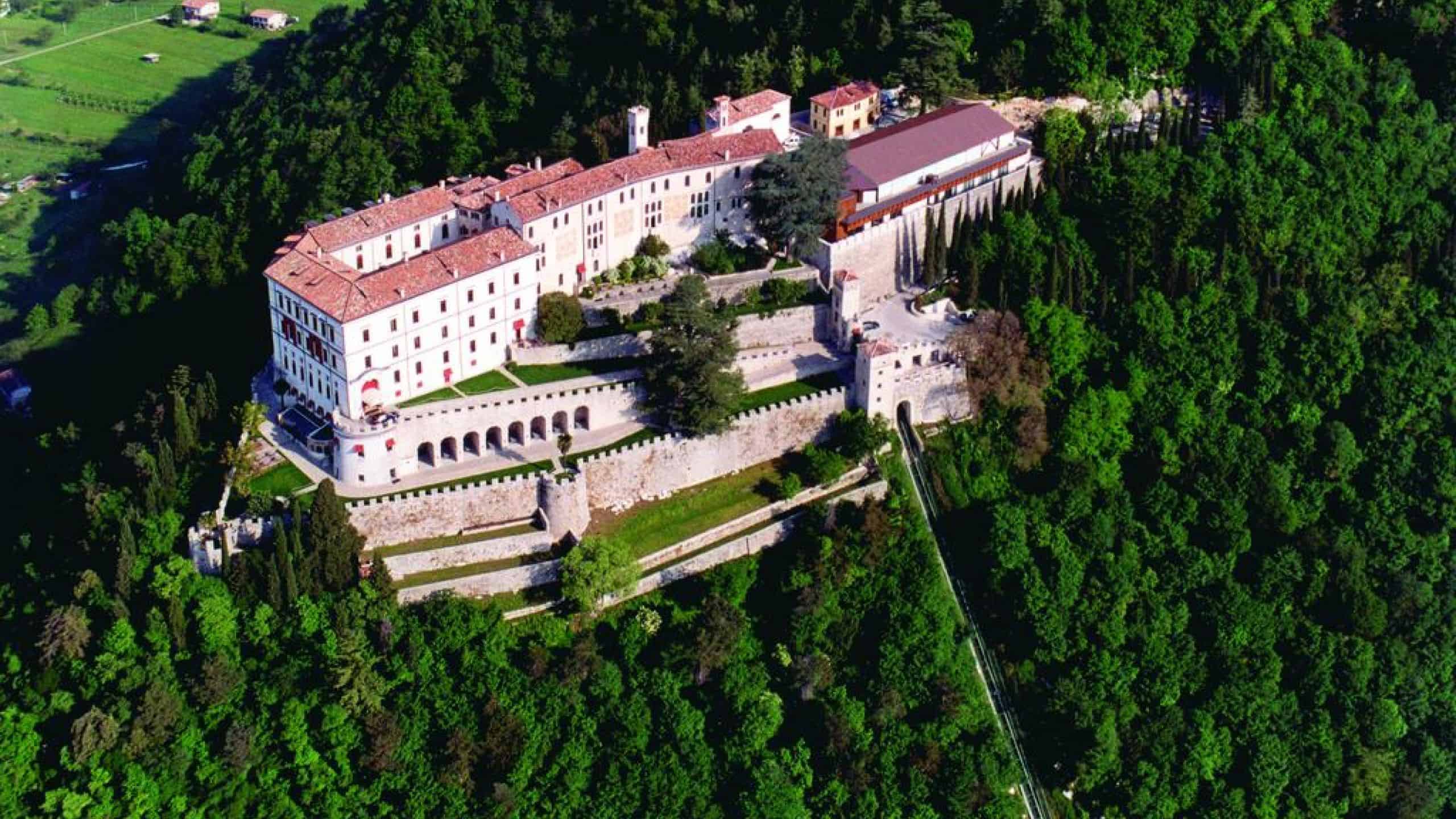 Immersa in 70 ettari di verde rigoglioso (Parco e Foresta), questa affascinante location, sorge infatti alle pendici del monte Castello, da cui domina il borgo di Cison di Valmarino (Treviso), per cui è magnificamente inserita nel paesaggio collinare trevigiano della via del Prosecco UNESCO.