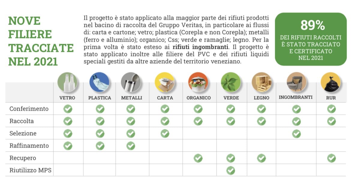Il Gruppo Veritas, che gestisce il ciclo dei rifiuti, dei servizi idrici nel territorio della città metropolitana di Venezia, ha avviato nel 2017 il proprio modello di tracciabilità (da allora realizzato ogni anno), permettendo in questo modo di ripercorrere la strada dei rifiuti all’interno di ognuna delle filiere della raccolta differenziata (organico, secco, plastica, carta, vetro, legno, metalli, ingombranti, verde e ramaglie): dal bidone o dal cassonetto fino al recupero di materia ed energia.