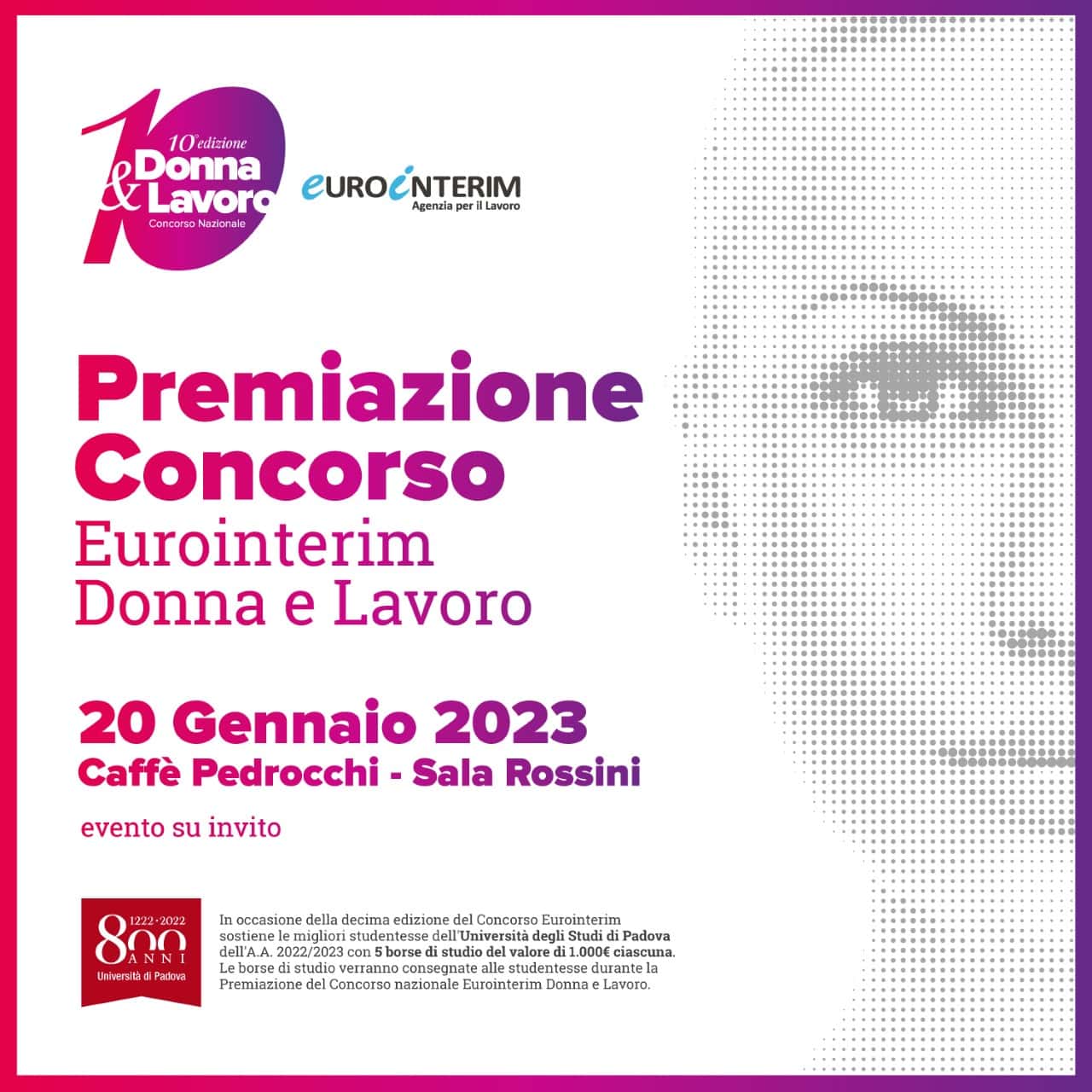 Eurointerim organizza dal 2007 il Concorso nazionale Donna e Lavoro, che promuove e valorizza idee al femminile, sostenendo la nascita e lo sviluppo di nuovi progetti di impresa pensati da donne o per le donne. Possono partecipare al Concorso imprenditrici di ogni età che si siano distinte nell’ambito lavorativo, fondando una nuova startup o contribuendo all’innovazione in un’azienda consolidata.  Il presidente Sposato racconta di aver  ricevuto centinaia di progetti davvero validi e interessanti e la giuria di esperti li ha esaminati con molta attenzione e impegno per stabilire le finaliste premiate al Caffè Pedrocchi  il 20 gennaio 2023.