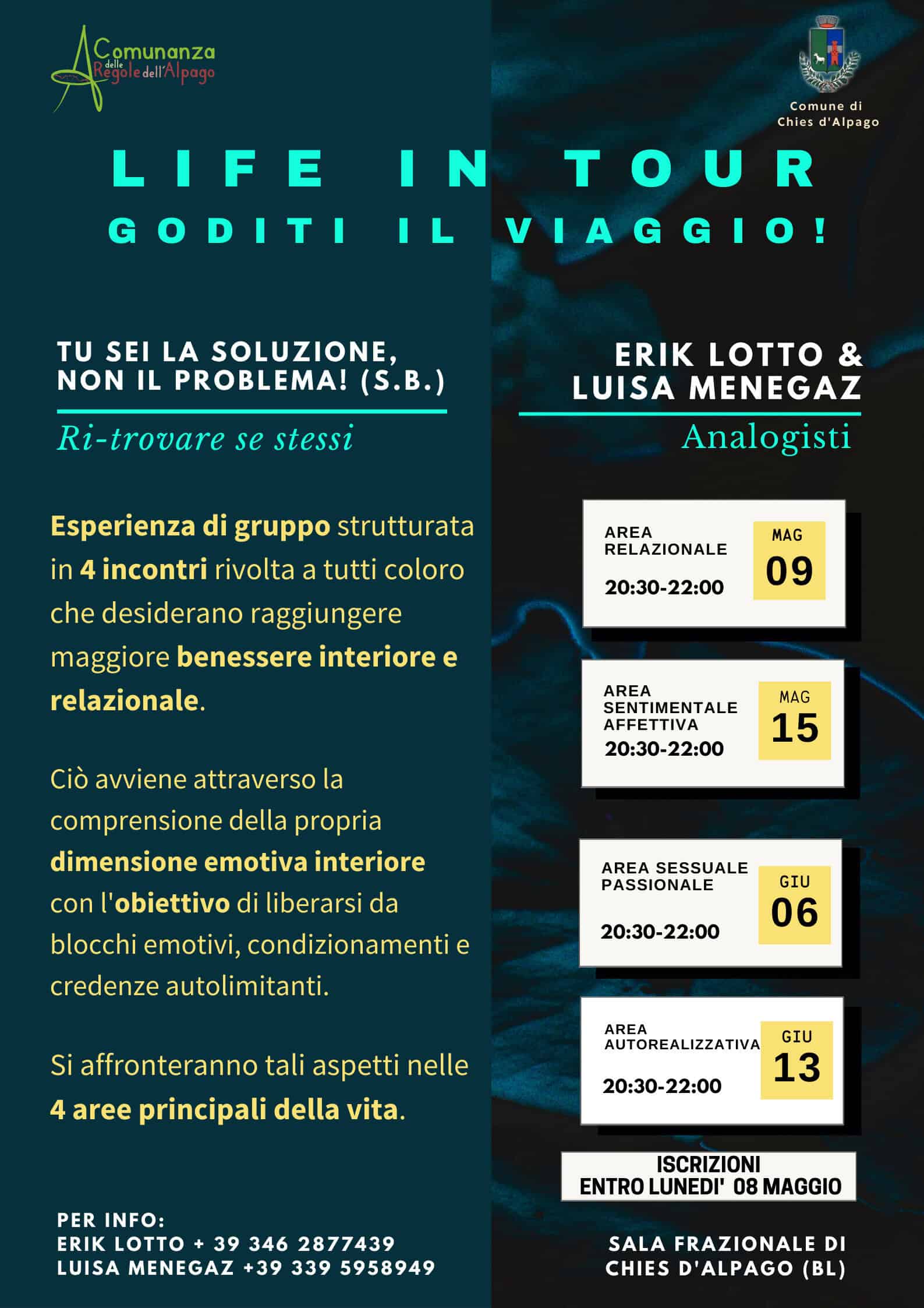 Per questo motivo Erik Lotto e Luisa Menegaz, hanno scelto di dedicare alla comunità della conca dell’Alpago anche un percorso di gruppo strutturato in 4 incontri in cui si darà l’opportunità di approfondire la conoscenza di sé e la risoluzione delle tensioni emotive di base presenti nelle principali aree della vita; ciò significa dare l’opportunità di rivedere il rapporto con i propri genitori, i pari e le persone significative, il rapporto con l’intimità, la sessualità e l’autorealizzazione sia in ambito professionale che di gestione del sé. Tale esperienza di gruppo si terrà martedì 09 maggio, lunedì 15 maggio, martedì 06 e 13 giugno dalle 20:30 alle 22:00 presso la sala funzionale di Chies d’Alpago.