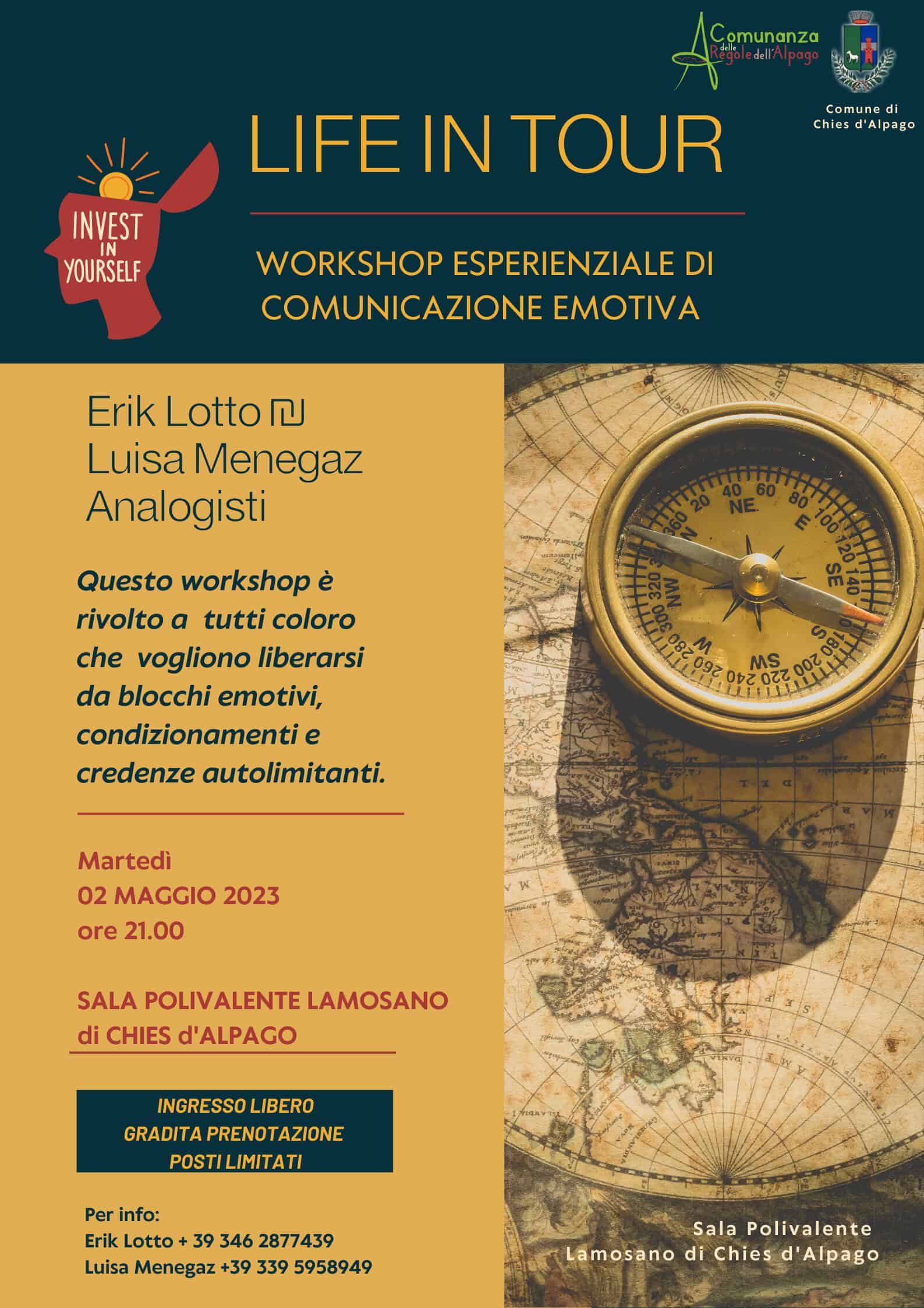 Si terrà martedì 2 maggio alle 21 il workshop esperienziale di comunicazione emotiva “Life in Tour”. Presso la sala polivalente di Lamosano di Chies d’Alpago gli analogisti Erik Lotto e Luisa Menegaz terranno una introduzione al Tour e spiegheranno le principali aree di interessate da questo percorso che tocca la dimensione emotiva interiore e che mira a liberarsi di quei condizionamenti emotivi che spesso ci limitano nell’agire e nell’esprimersi quotidianamente.
