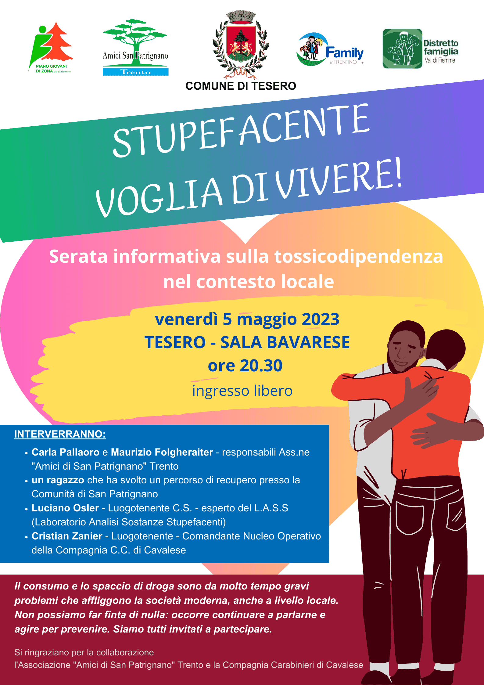 A questo proposito l’Amministrazione Comunale di Tesero organizza e promuove una serata informativa sul tema “sostanze stupefacenti” in programma venerdì 5 maggio 2023 alle ore 20.30 presso la Sala Bavarese (piano superiore del Teatro Comunale di Tesero, in Via Noval n. 5) con ingresso libero.