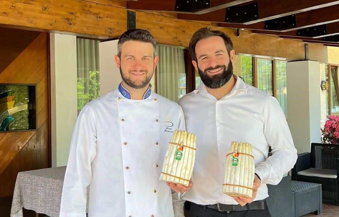 Mio padre più di 30 anni fa era presidente del gruppo di Ristoratori di Bassano. Fu allora che partì l’idea di valorizzare l’asparago bianco di Bassano Dop abbinandolo al vino Vespaiolo di Breganze. Con l’uva vespaiola si prepara il passito Torcolato, ma la sua giusta acidità e il gusto si sposano bene con l’asparago. Ecco allora il piatto ormai tipico e stagionale di Bassano : il risotto di asparagi di Bassano accompagnato dal Vespaiolo.