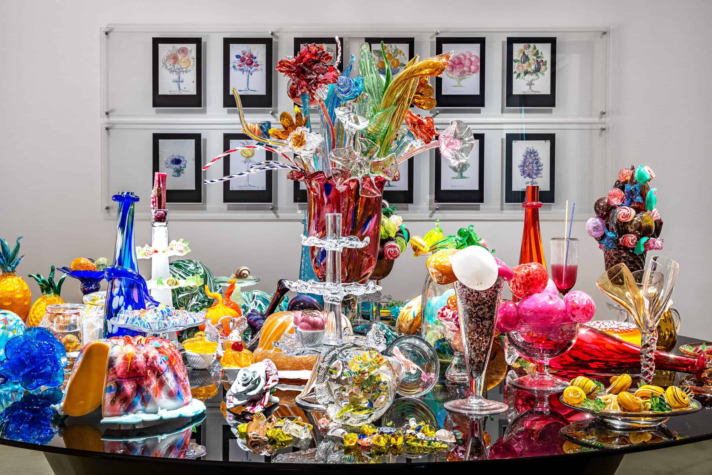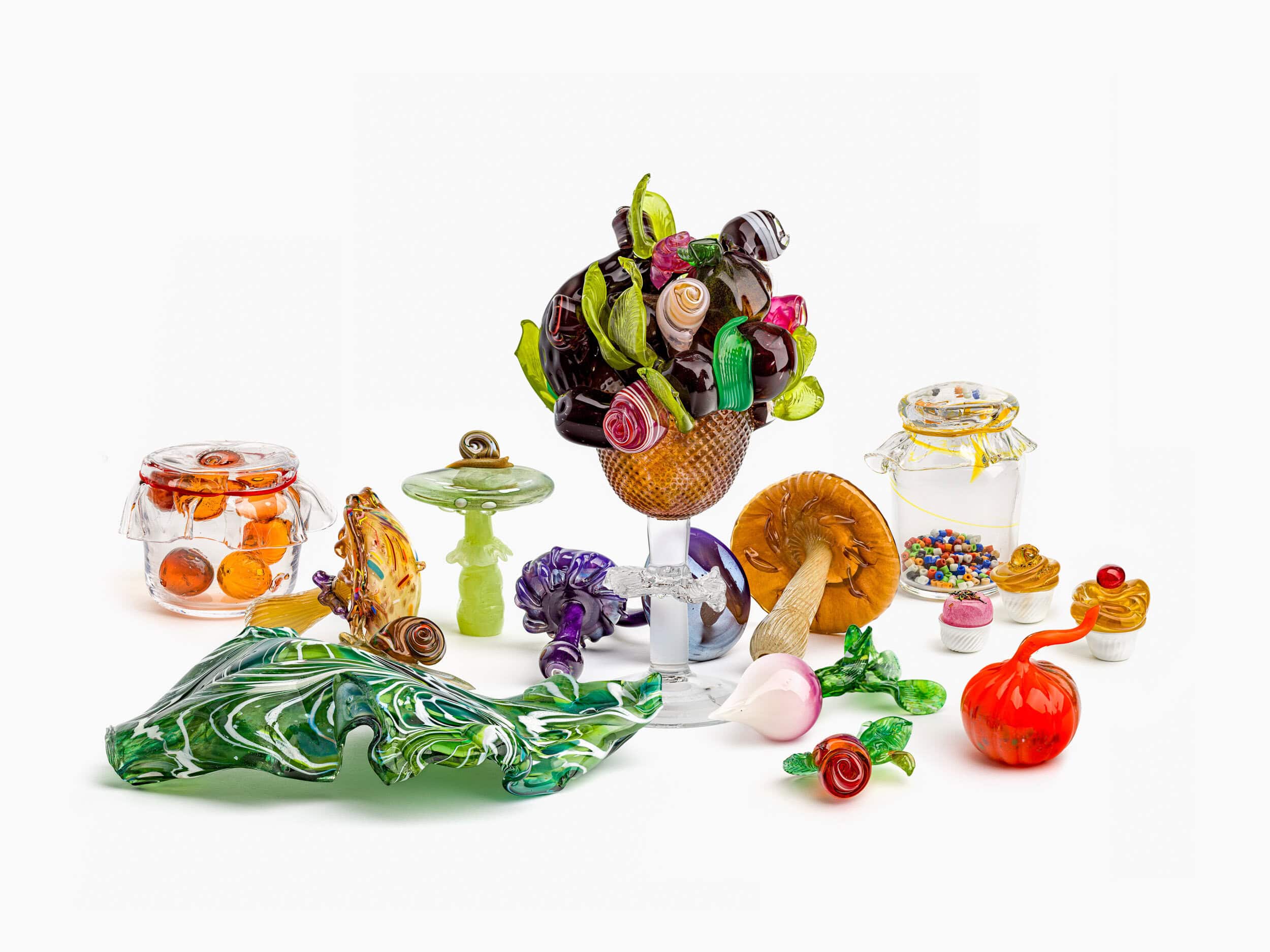 Il percorso espositivo inizia con uno strepitoso colpo d’occhio: bouquet di fiori, vassoi di pasticcini, gomitoli di lane, vasetti di marmellata tutti rigorosamente in vetro, rappresentazione ante litteram dell’universo femminile e del lavoro domestico della donna. Da queste seducenti composizioni alle opere in cristallo ottico di grande impatto per purezza e minimalismo. L’innovazione è un tratto distintivo di maestri che a partire dagli anni ’40 inventeranno nuovi concetti estetici. Tra loro c’è chi si dedica a sperimentazioni sul vetro casting o fusione a stampo aperto. La lavorazione a casting diventerà simbolo del vetro moderno cecoslovacco con opere maestose, straordinarie nella purezza dei colori e delle trasparenze.