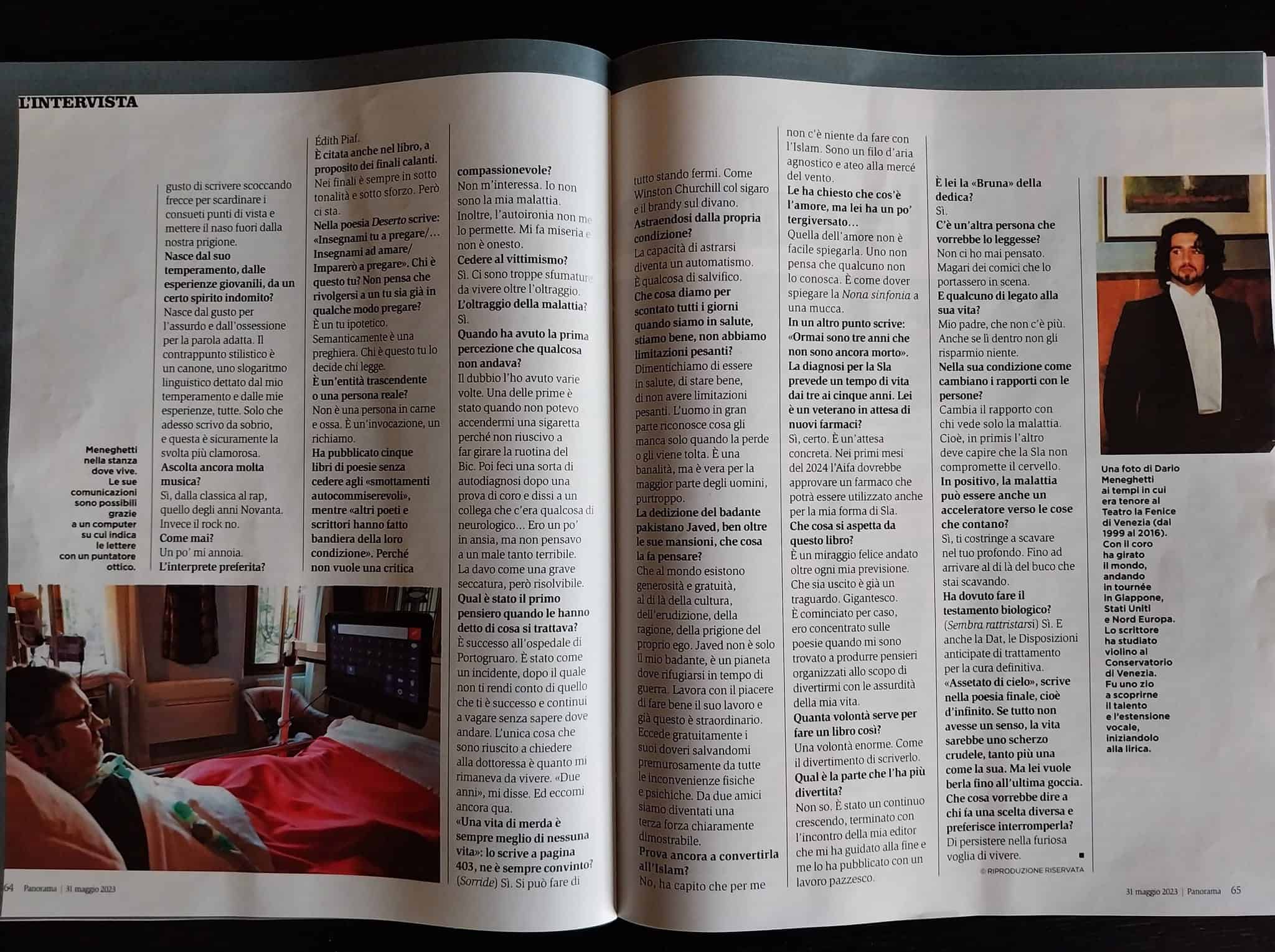 La voglia di vivere, la speranza che a breve l’AIFA (Agenzia italiana del farmaco) approvi una terapia per la SLA, non abbandonano mai Meneghetti, che continua a scrivere, anche poesie come questa, di cui riportiamo i primi versi che danno il titolo al libro: