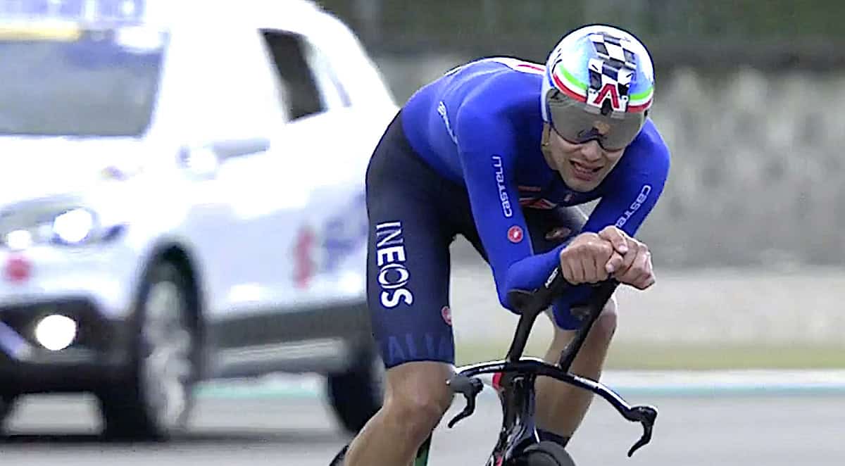 Esplode sempre in ritardo, ma fa sempre il bottino. Filippo Ganna vince la medaglia d’oro con una rimonta incredibile nella sfida contro il britannico Daniel Bigham: i due avevano il Missile della Cicli Pinrarello. 4:01.976 il tempo finale dell’azzurro, che nell’ultimo km ha recuperato ben 2” di svantaggio con una progressione che profuma di impresa, battendo il britannico di soli 54 millesimi e conquistando così il suo sesto successo iridato nella specialità. Sale invece sul terzo gradino del podio Jonathan Milan, che si impone nettamente nel duello per il bronzo con il portoghese Ivo Oliveira.
