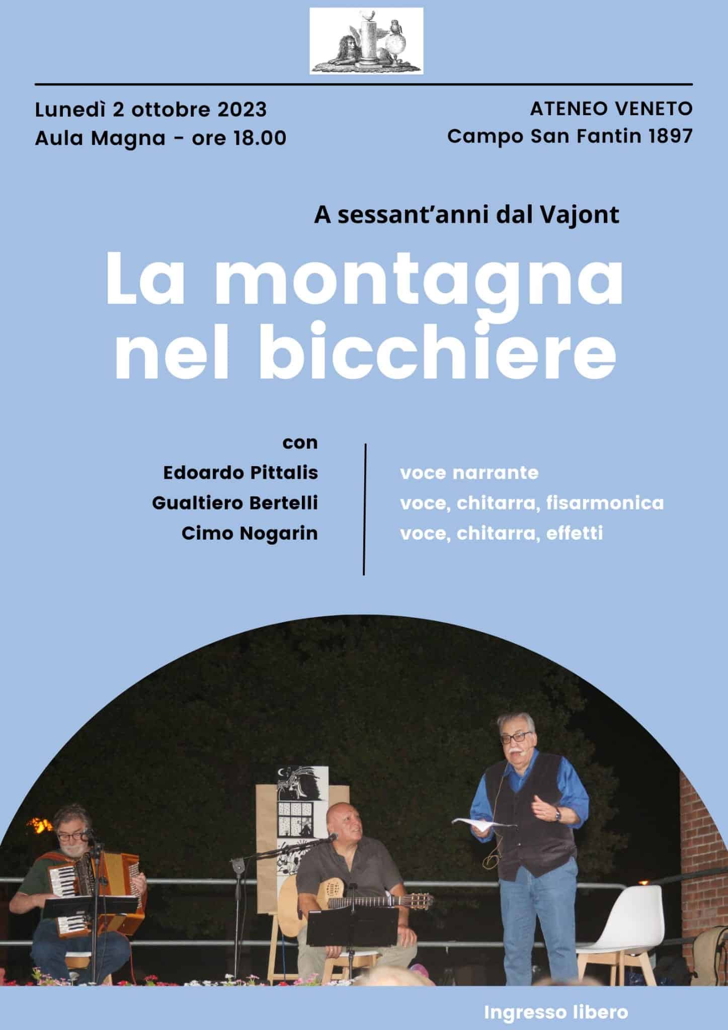 “La montagna nel bicchiere. A sessant’anni dal Vajont”. Con uno spettacolo l’Ateneo Veneto vuole ricordare la tragedia del Vajont che causò quasi duemila morti. L’appuntamento è per lunedì 2 ottobre alle ore 18 nell’Aula Magna in Campo San Fantin a Venezia. Ingresso libero. A introdurre la serata la presidente dell’Ateneo, Antonella Magaraggia.