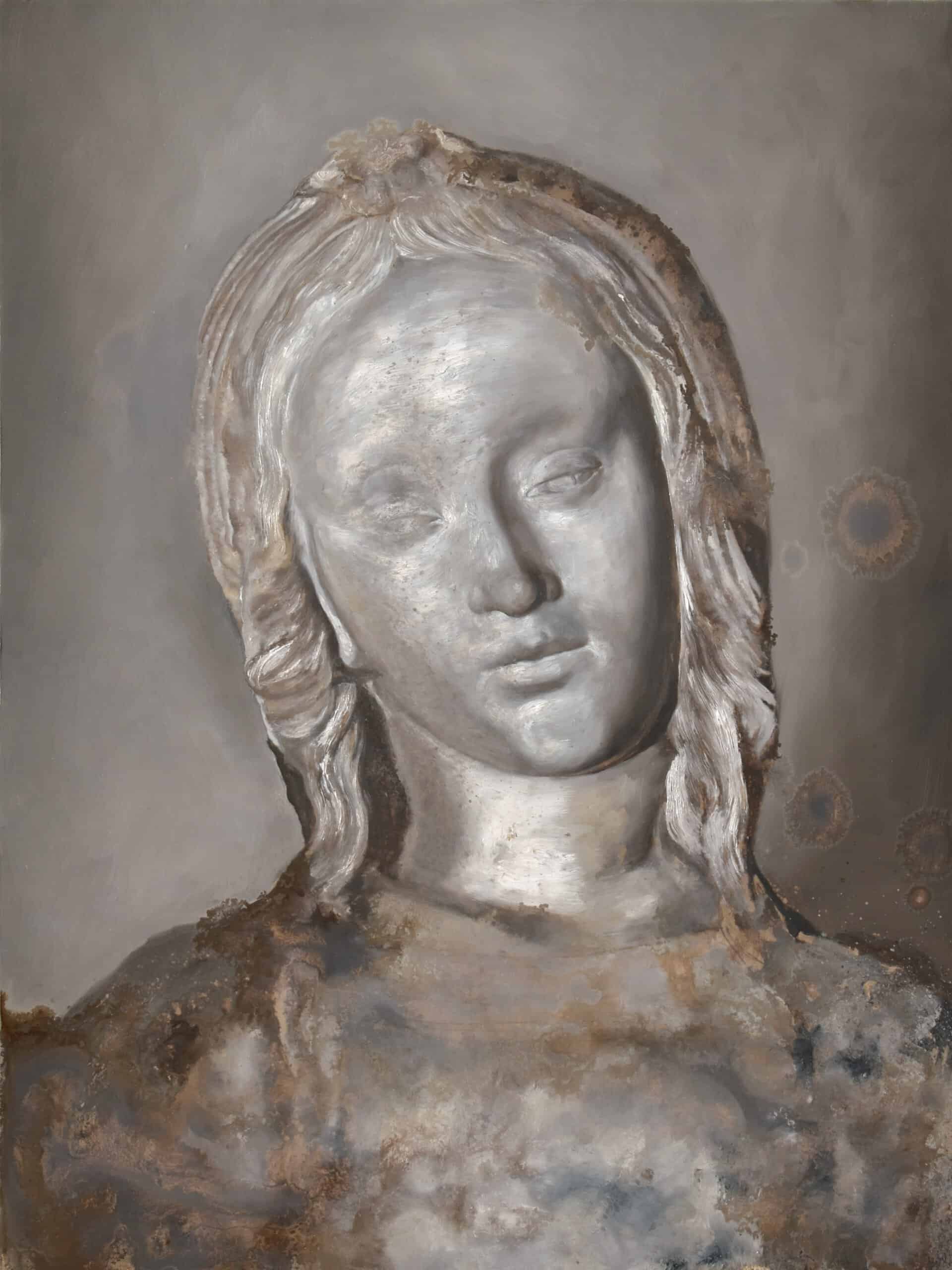Una visione pittorica della classicità ci viene offerta da Leonardo Dalla Torre (Venezia, 1995). Nello spazio da lui dipinto prendono forma corpi, volti e sguardi rievocati dalle forme della pittura del passato delineate dai Maestri della Storia dell’Arte. Esse vengono utilizzate come pretesto per attuare un intervento inaspettato. La forma viene spesso compromessa, sottratta e stravolta.