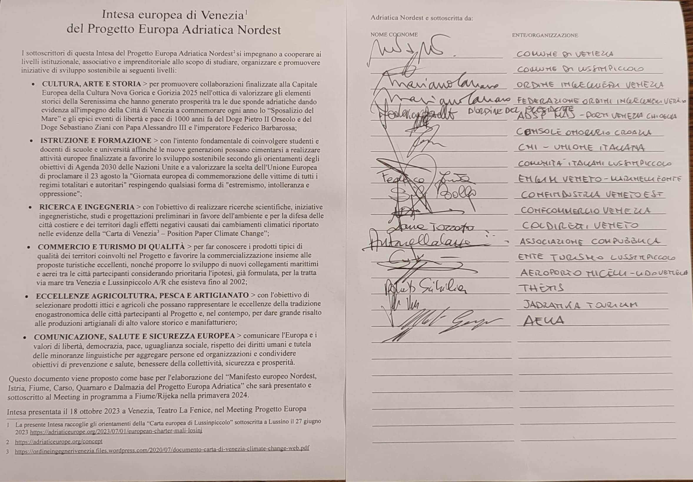 18 enti e organizzazioni del Nordest hanno sottoscritto l’Intesa Europa Adriatica al Meeting che si è svolto tra l’Aeroporto Nicelli del Lido di Venezia e il Teatro La Fenice con il supporto del Comune di Venezia, l’Ordine Ingegneri Venezia, l’Autorità di Sistema Portuale del Mare Adriatico Settentrionale e i molti partner. Al Meeting era presente una folta delegazione di Lussinpiccolo guidata dalla Sindaca Ana Kucic con la partecipazione della Console Onoraria della Croazia in Italia Nela Sersen e del Presidente della Giunta Esecutiva dell’Unione Italiana Marin Corva.