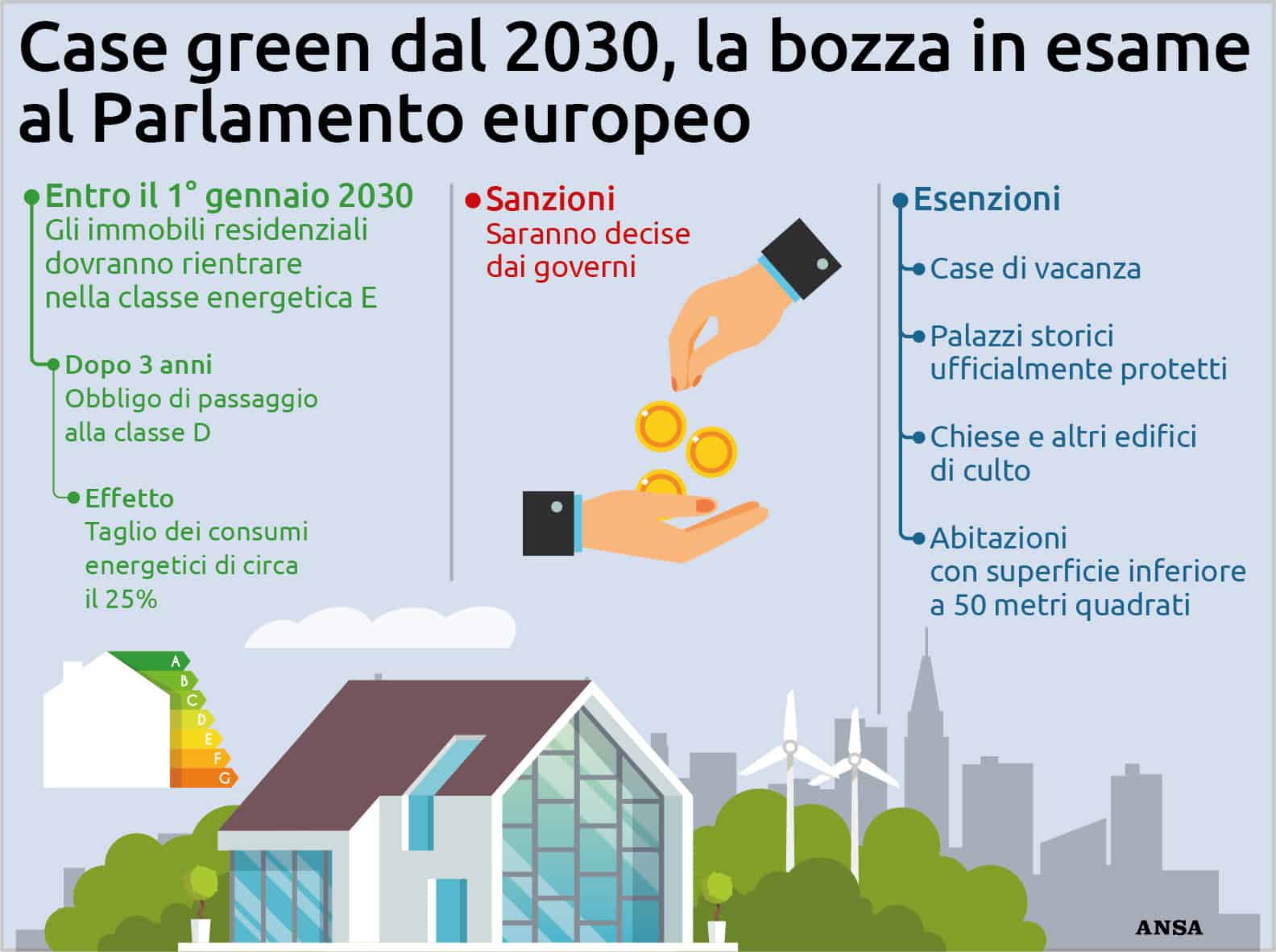 Secondo l’accordo provvisorio raggiunto il 12 Ottobre, entro il 2030 e il 2035, si dovrà raggiungere un obbiettivo (da definire) di risparmio energetico per gli edifici, e le varie nazioni dovranno decidere un calendario per arrivare all’emissione “zero” entro il 2050.