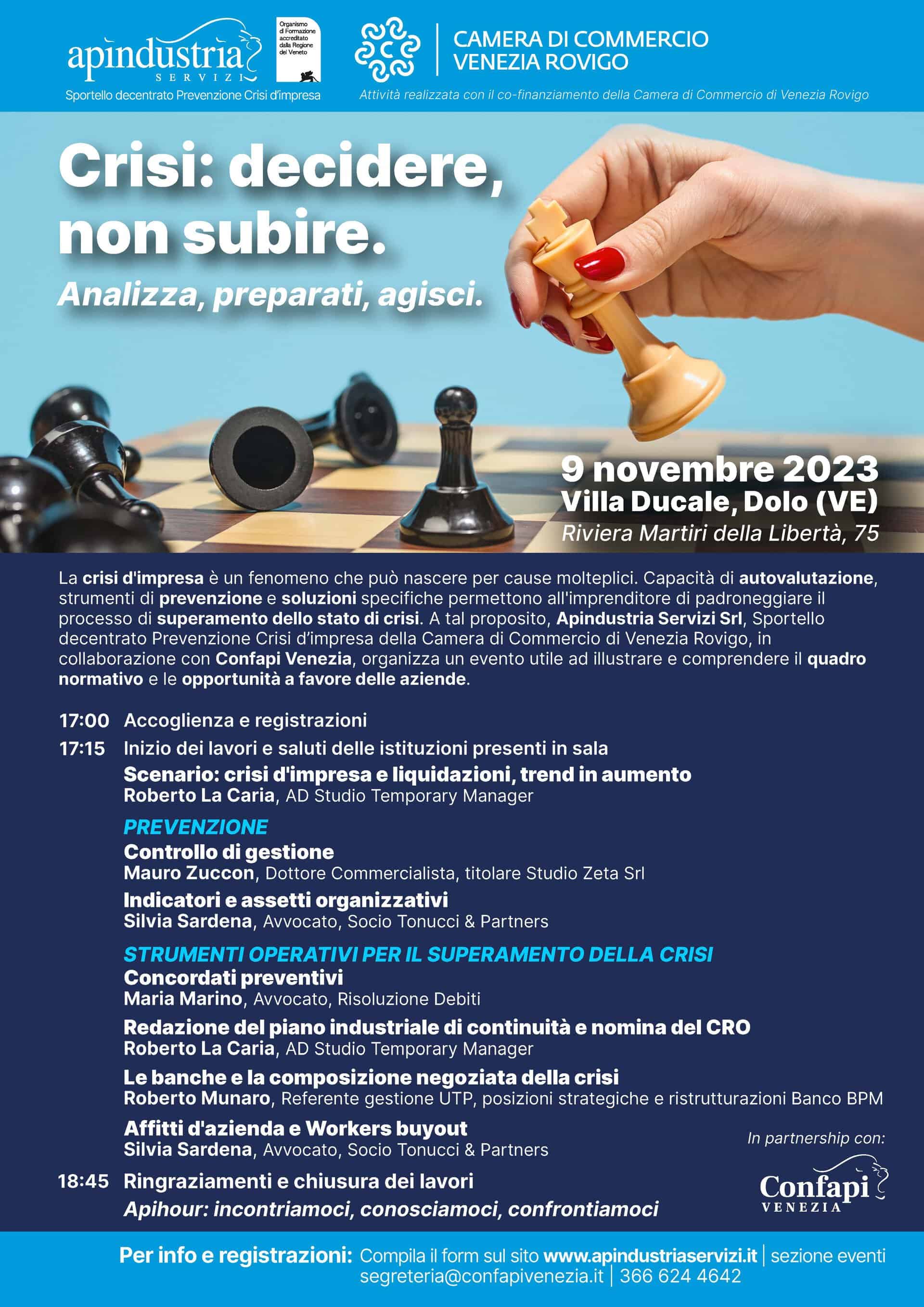Giovedì 9 novembre p.v., in orario 17.00-19.00, presso Villa Ducale a Dolo (Riviera Martiri della Libertà 75), si terrà convegno gratuito “Crisi: decidere, non subire. Analizza, preparati, agisci.”
