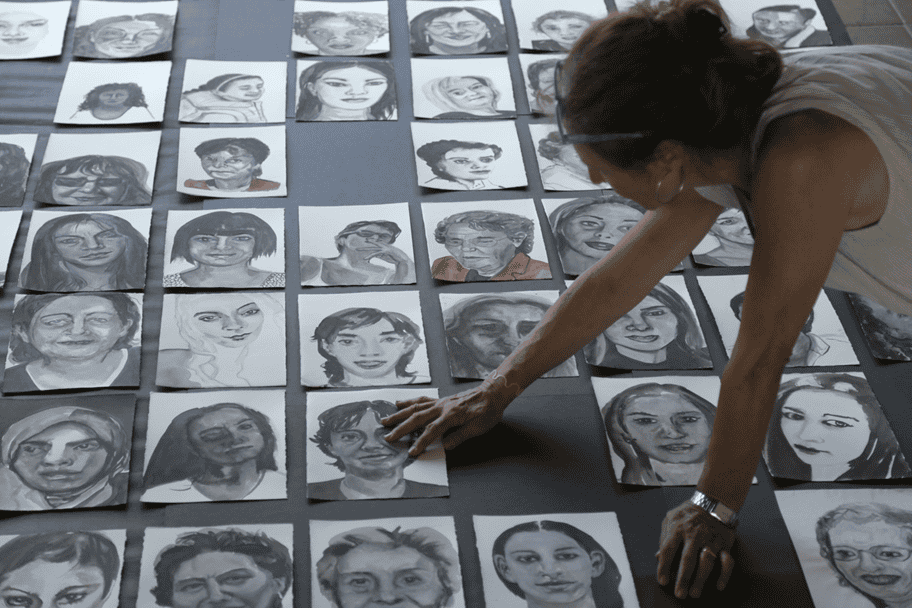 C’è anche chi, come l’artista Paola Volpato, ha scelto di denunciare con altri mezzi. I mezzi potenti, strutturalmente eversivi dell’evento artistico. Dal 2015, Paola ha deciso di realizzare i ritratti di tutte le donne vittime di femminicidio in Italia: ad oggi sono oltre settecento. Un’infinita galleria di volti, non ancora preda del terrore: negli occhi fiducia nel futuro, certezze, talvolta pensieri fugaci di gioia. Un’arte scabra, essenziale, dove il percorso dell’artista potrebbe avere, invece, spunti autoreferenziali; un registro minuzioso, ad individuare ogni traccia. Poi, le mappe dei visi vanno esposte, proposte ad ogni pubblico, dalle sedi istituzionali come il Parlamento alle biblioteche, ai Centri Civici: ogni volta, un urlo senza voce, il più acuto.