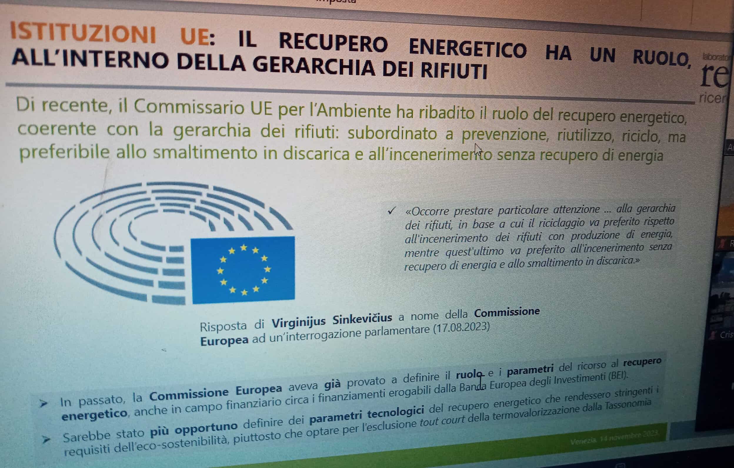“L’Unione europea dà chiare indicazioni per un riciclo che deve essere non inferiore al 65% . Ed a cui è associata la necessità di ridurre drasticamente il ricorso alla discarica per percentuali anche inferiori al 10% – ha sottolineato Andrea Ballabio, economista di Laboratorio REF ricerche-. In quest’ottica il recupero energetico dai rifiuti diventa strategico andando ad integrare, per il 30% circa, il riciclo promosso con l’economia circolare. Si tratta di un percorso, rispetto al quale il Nord d’Italia ed il Veneto sono ai vertici della classifica nazionale, ma che vede ancora in posizioni arretrate il Meridione. Approccio e mentalità però stanno cambiando rapidamente. Perché ormai anche i cittadini si rendono conto dell’efficacia e dell’efficienza di una gestione dei rifiuti che associa il riciclo derivato dalla raccolta differenziata al recupero energetico. Riducendo al massimo il ricorso alla discarica”.