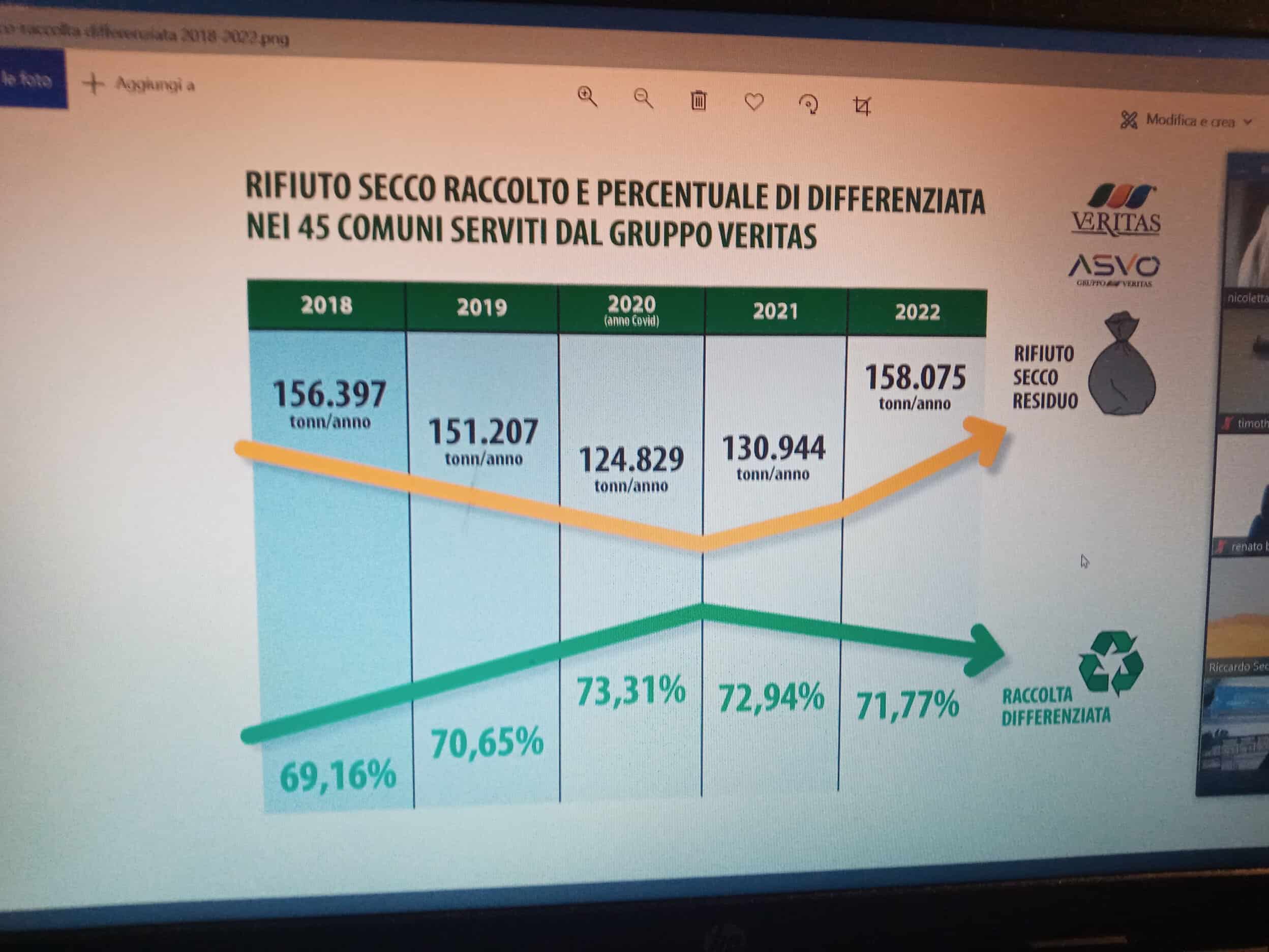 “Ogni anno Gruppo Veritas raccoglie circa 530mila tonnellate di rifiuti – ha illustrato Riccardo Seccarello, responsabile comunicazione Veritas – . Il rifiuto indifferenziato ammonta a circa 158mila tonnellate. Si tratta di materiali che non rientrano nelle diverse filiere della raccolta differenziata. Ma rispetto alle quali, all’interno degli impianti di Ecoproetto, società del Gruppo Veritas, vengono comunque realizzate ulteriori selezioni. Questo per estrarre quanto ancora potenzialmente riciclabile, ad es riguardo gli scarti di plastiche.