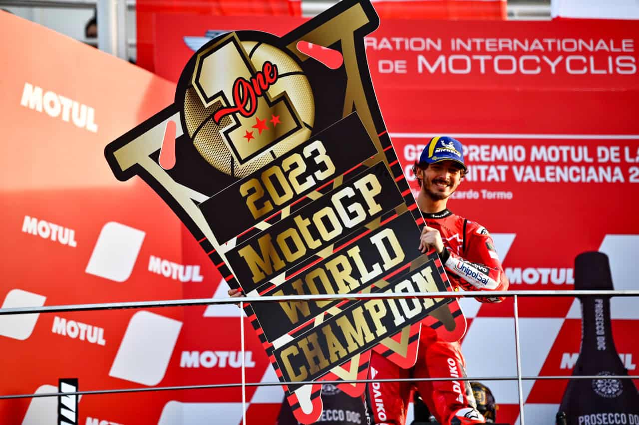 “Pecco ha disputato una stagione incredibile – prosegue Domenicali – e in questa giornata riscrive nuovamente la nostra storia, diventando il primo pilota Ducati due volte campione del mondo in motogp. Complimenti anche a Jorge per aver infiammato il duello per la conquista del titolo fino all’ultima gara e a Bezzecchi, a lungo parte della sfida iridata. Il podio della classifica generale premia tre piloti Ducati, è la più grande ed evidente dimostrazione della nostra supremazia nella massima competizione su due ruote. Confermarsi a questi livelli dopo la fantastica stagione 2022 era una sfida complessa, che abbiamo accolto con passione e orgoglio. Abbiamo ai titoli mondiali motogp e superbike aggiungiamo quello di Supersport.