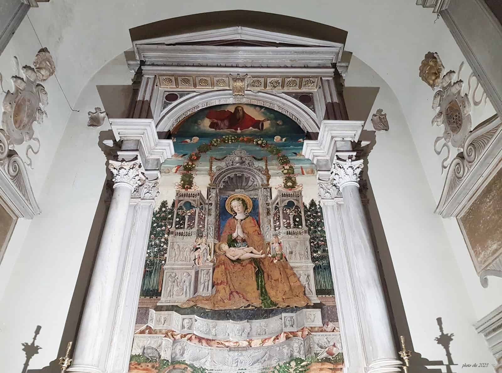 Dalla chiesetta dedicata a San Marco di un tempo, al monumentale edificio costruito a partire dal 1534 su progetto di Jacopo Sansovino con la splendida facciata affidata a Palladio interamente in pietra d’Istria. L’interno con le tre navate imponenti e luminose, custodisce un capolavoro del quattrocento da vedere assolutamente: “Madonna con Bambino in trono” di Antonio da Negroponte. Tempera su tavola, bella e misteriosa quanto la produzione artistica del suo autore. Esiste solo quest’opera con il suo nome. Era un religioso, firmò così la pala: “Frater Antonius de Negropon. Pinxit”. L’opera rappresenta la Madonna con il Bambino circondata da putti e ghirlande floreali, con dettagli di vegetali e animali dall’incantevole simbolismo gotico.