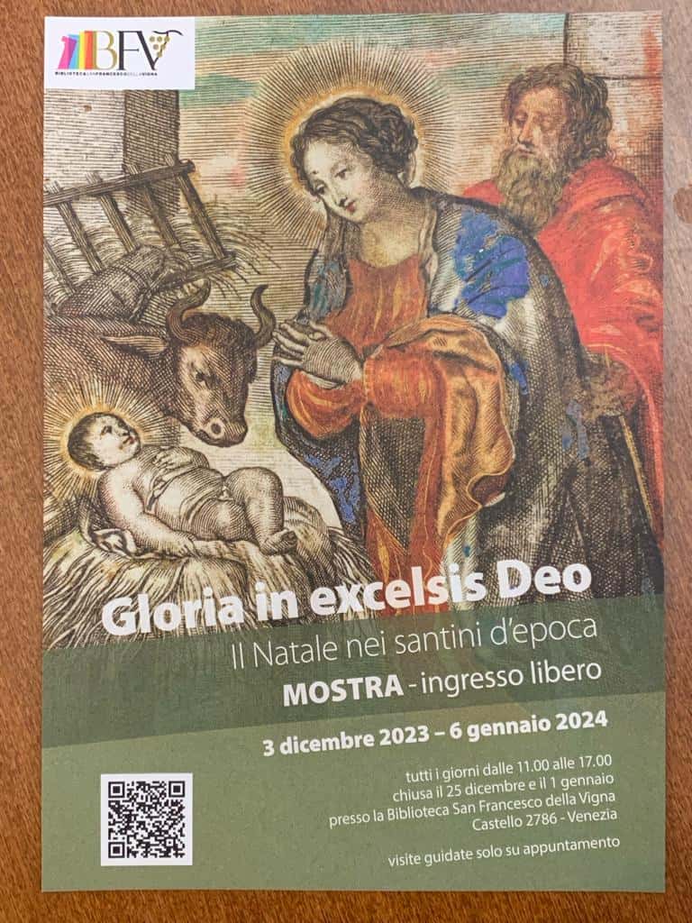 “Vorrei fare memoria di quel Bambino che è nato a Betlemme, e in modo intravedere con gli occhi del corpo i disagi in cui si è trovato per la mancanza delle cose necessarie a un neonato; come fu adagiato in una mangiatoia e come giaceva sul fieno tra il bue e l’asinello”. Questo il desiderio del beato Francesco molto impressionato da un suo viaggio in Palestina. C’era un luogo in Italia che gli ricordava emotivamente Betlemme, lo splendido borgo di Greccio arroccato su un bastione roccioso affacciato sulla Valle Santa Reatina. Così decise di realizzare il primo presepe vivente. Era il 1223, sono passati 800 anni da allora. In occasione di questa ricorrenza, la Biblioteca di San Francesco della Vigna a Venezia ha organizzato una mostra davvero straordinaria dal 3 dicembre sino al giorno dell’Epifania e che ha registrato un grande afflusso di pubblico: “Gloria in excelsis Deo – Il Natale nei santini d’epoca”.