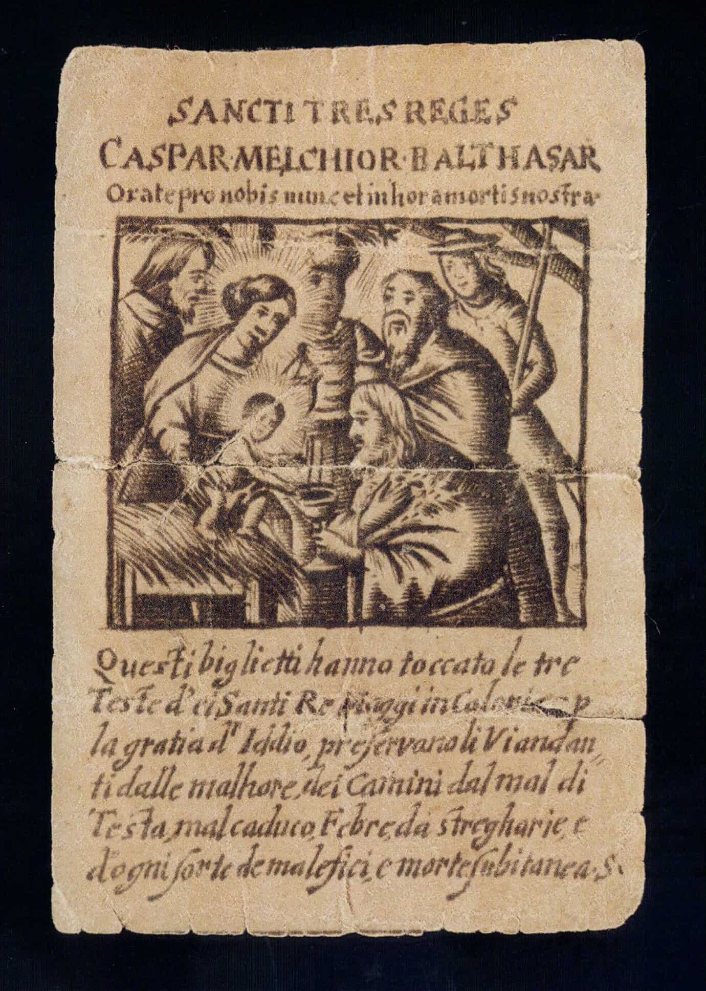 Migliaia di santini di ogni epoca con esemplari antichissimi risalenti al 1600, tra cui spicca la xilografia Sancti tres reges, XVII secolo, immaginetta che veniva usata come portafortuna, cucita nelle vesti o inserita nei bauli durante i viaggi.